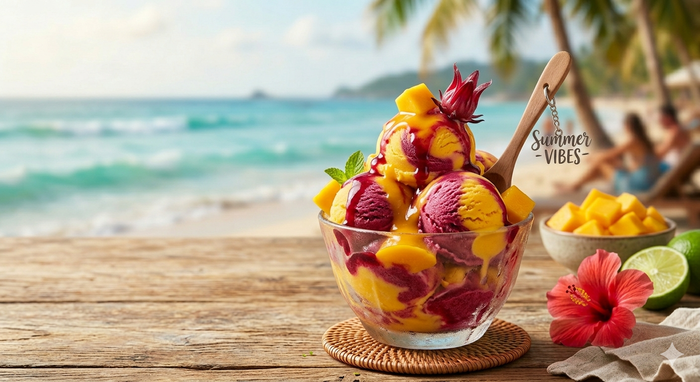 2. ไอติมมะม่วง + กระเจี๊ยบแดง (รสเปรี้ยวอมหวาน ไทยๆ แปลกใหม่)