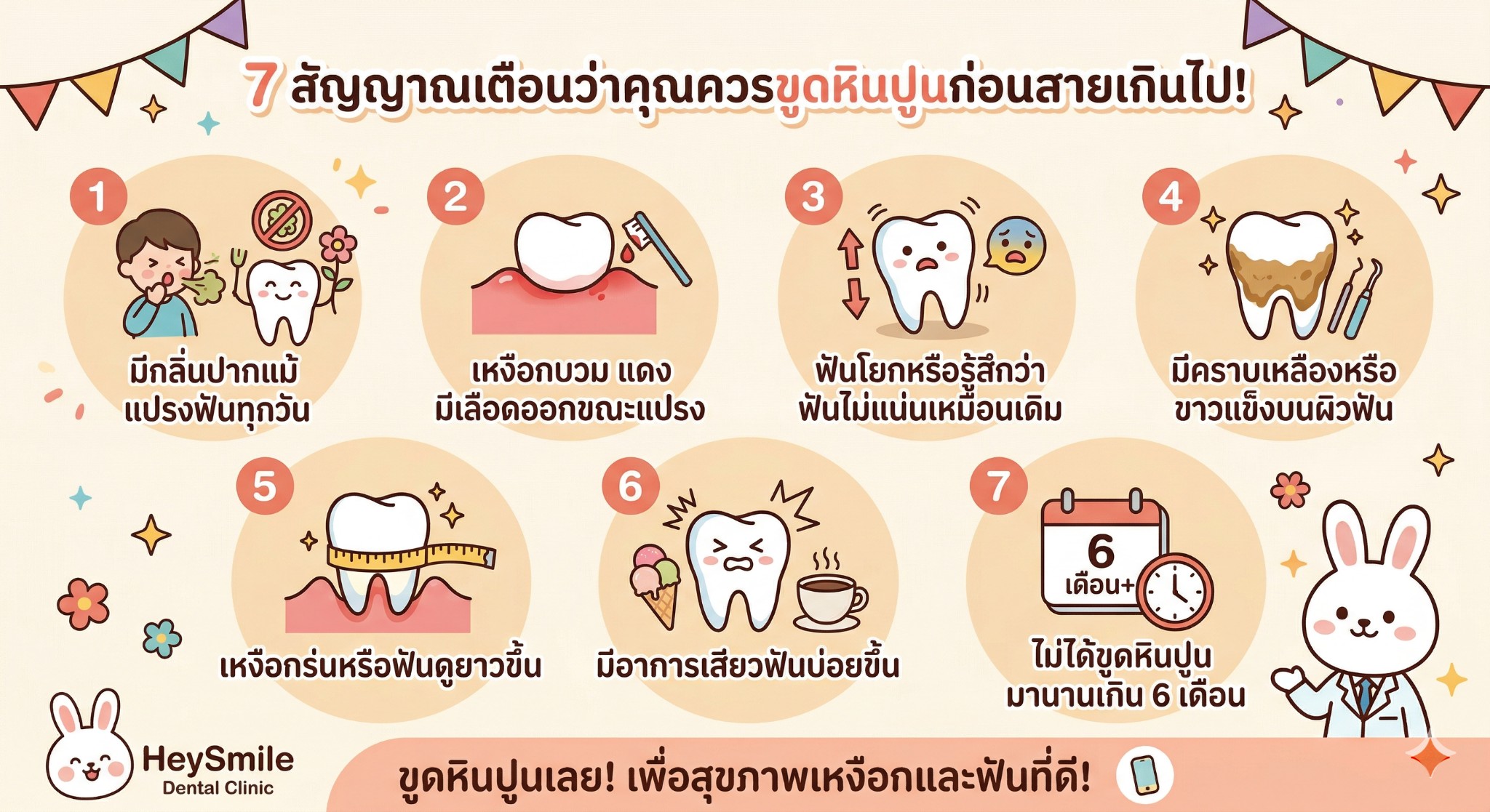 การขูดหินปูนเป็นการป้องกันที่คุ้มค่ากว่าการรอให้ฟันพังแล้วค่อยรักษาแน่นอนครับ ใครที่เริ่มมีสัญญาณเตือน หรือถึงรอบเช็กอัปแล้ว อย่ารอช้านะครับ แวะเข้ามารับการตรวจฟันและปรึกษาฟรี! กับทีมคุณหมอเฉพาะทางได้ที่ HeySmile Dental Clinic ยินดีดูแลรอยยิ้มของทุกคนครับ!