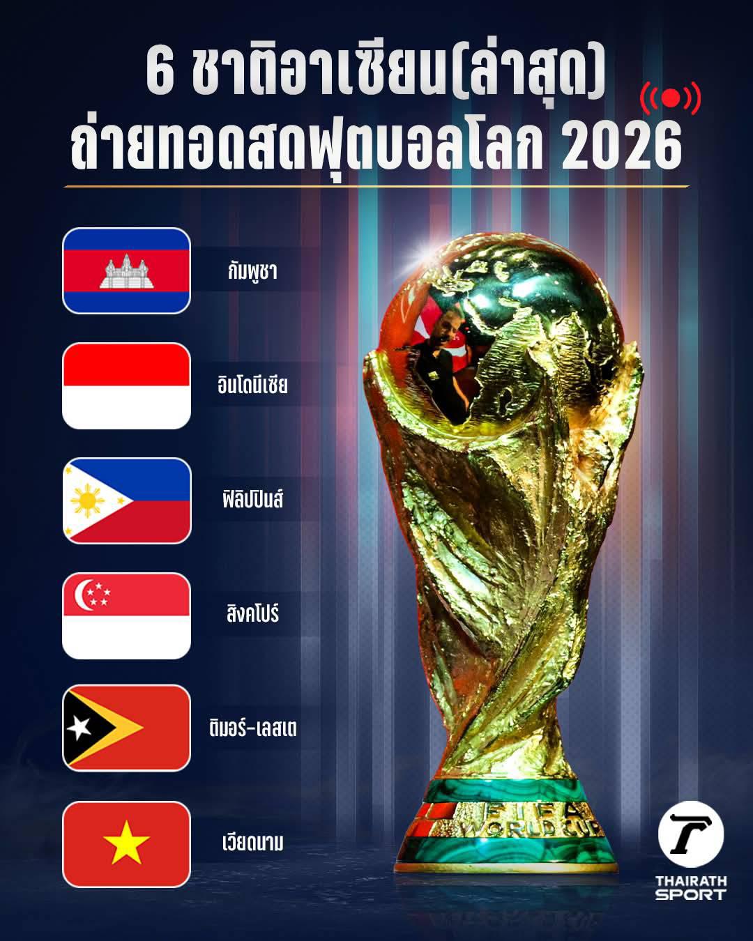 6 ชาติอาเซียน (ล่าสุด) ถ่ายทอดสดฟุตบอลโลก 2026 รอบสุดท้าย