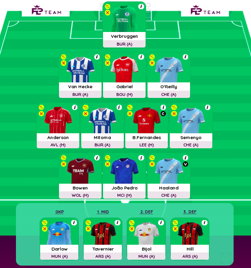 อย่างที่เกริ่นไป ทีมที่ยังมีลุ้น ยังไงก็น่าเลือก ยิ่งซิตี้มี DGW33 และ DGW36 (รอยืนยัน แต่ไม่น่าพลาด) การมีแข้งพวกเขาแบบครบ 3 ตัว จึงเป็น template จำเป็น ตัวเต็งตอนนี้ คงไม่หนี ฮาลันด์, เซเมนโย, โอไรลีย์