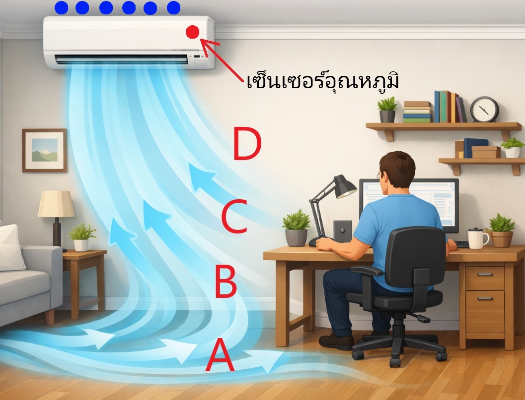 ซึ่งปัญหาสำคัญของฤดูร้อนก็คือ .... เมื่อแอร์เริ่มทำความเย็นจะมีอากาศเย็นไหลออกมาตามภาพนี้ครับ อากาศเย็นจะมีความหนาแน่นสูงจึงกองอยู่ที่พื้นด้านล่างของห้อง และอากาศเย็นจะค่อย ๆ เพิ่มระดับไปตามตำแหน่ง A B C D ในภาพนี้จนถึงตำแหน่งจุดสีน้ำเงินในภาพ
