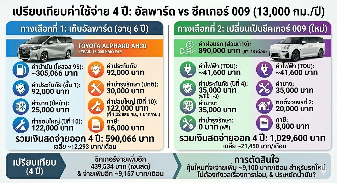 1. ถ้าผมขายอัลพาร์ดคันนี้ ไปซื้อ zeeker 009 ที่ราคา 2.39 ล้าน จากการใช้งานแบบข้างต้น เทียบกันไปอีกสัก 4 ปี ค่าใช้จ่าย จะต่างกันยังไงบ้าง