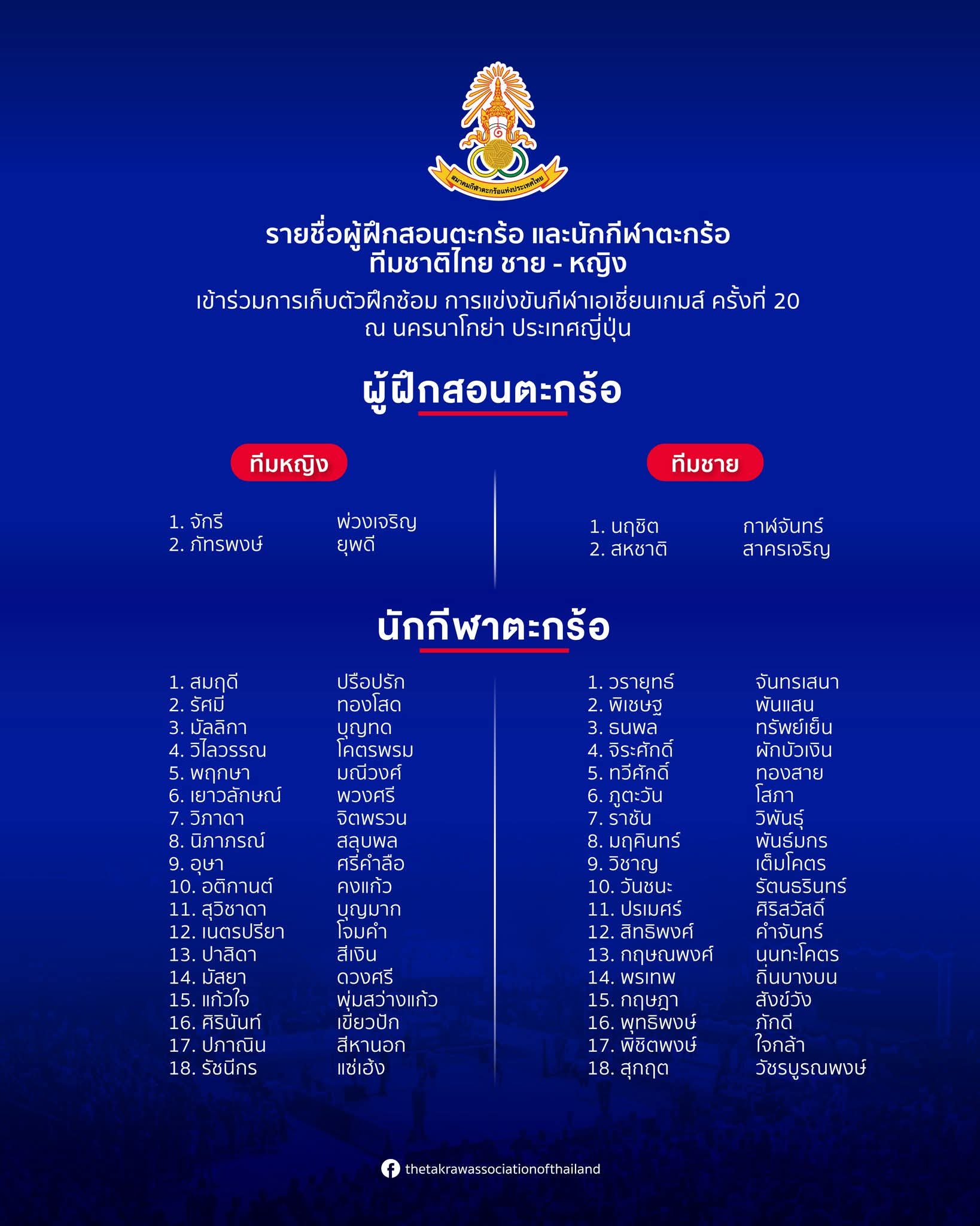 📣 รายชื่อผู้ฝึกสอน และนักกีฬาตะกร้อทีมชาติไทย ชาย - หญิง เข้าร่วมการเก็บตัวฝึกซ้อม กีฬาเอเชี่ยนเกมส์ ครั้งที่ 20