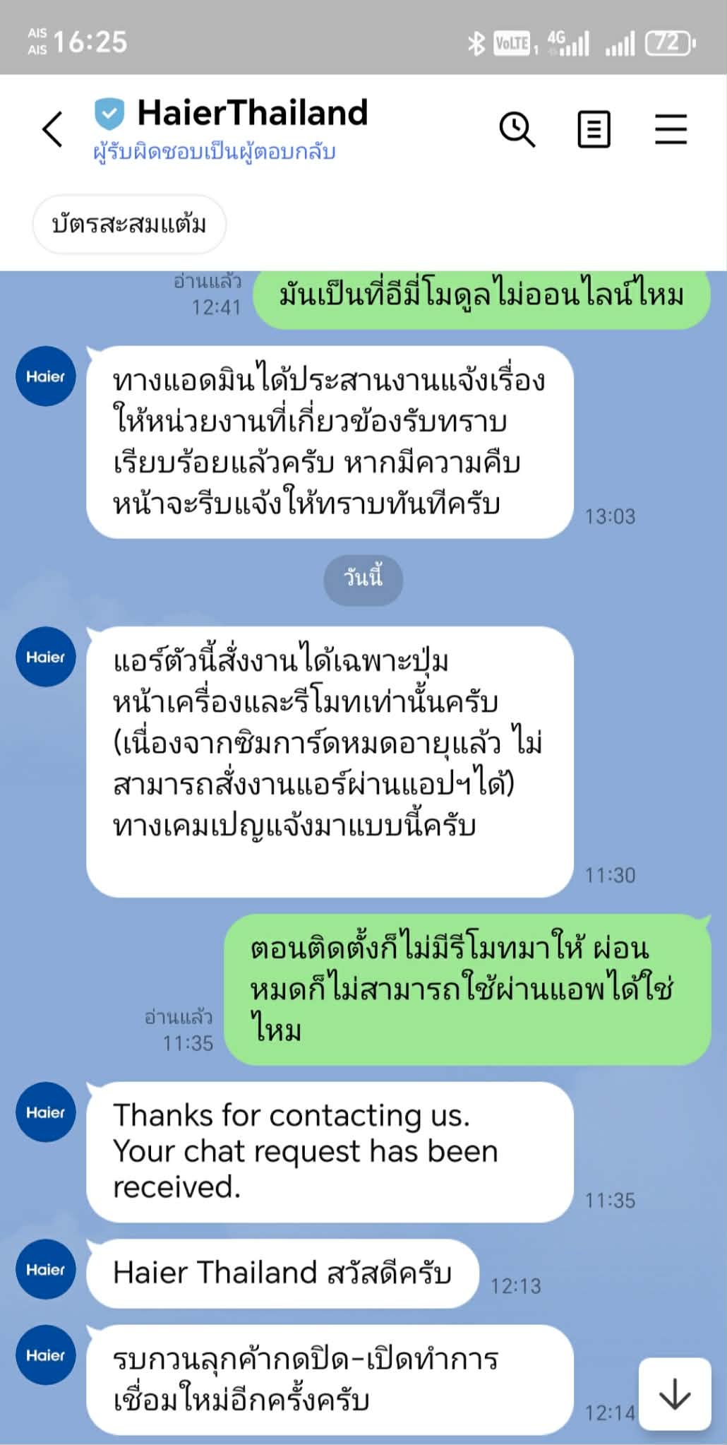 แอร์ Haier แบบผ่อน ผ่อนหมดแล้ว มาตอนนี้สั่งงานผ่านแอพ yudee ไม่ได้ เหมือนอีมี่ที่ติดบนแอร์หมดอายุทำให้ไม่สามารถสั่งงานออนไลน์ได้ Haier Thailand บอกถ้าจะใช้งานต้องกดหน้าเครื่อง หรือซื้อรีโมทมาใช้ ตอนติดตั้งก็ไม่ได้ให้รีโมทมา ใครใช้แอร์เติมเงิน Haier เป็นแบบนี้กันไหม ผ่อนหมดไม่สามารถสั่งผ่านแอพได้ ต้องหาซื้อรีโมทมาใช้เอง เหมือนโดนลอยแพเลย