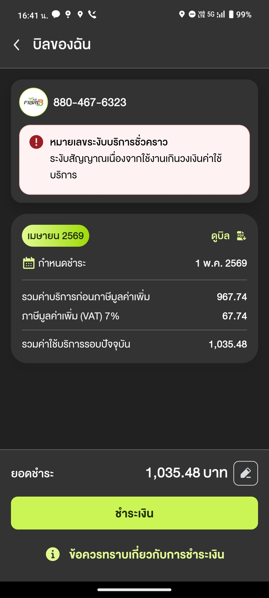 เน็ต Ais fiber พอดีเราไม่มีตังจ่ายบิล เลยเลท 4-5 วัน แต่เน็ตโดนตัดก่อน แต่พอจะจ่ายบิลทำไมมันให้จ่ายยอดเดือนหน้าด้วย ปกติเดือนละ 535 บาท แต่มันให้จ่าย 2ยอด เป็น 1070 บาท แต่เรามีตังจ่ายแค่ 535 เลยสงสัย
