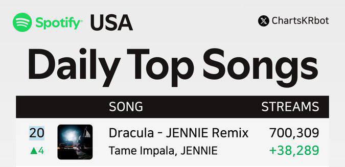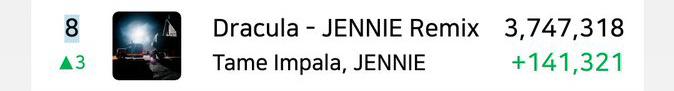 เพลง ‘Dracula’ (Remix) โดย Tame Impala และ JENNIE ขึ้นสู่จุดสูงสุดใหม่ที่อันดัย #8 (+3) บนชาร์ต Spotify ทั่วโลก ด้วยยอดสตรีม 3.74 ล้านครั้ง 🥳