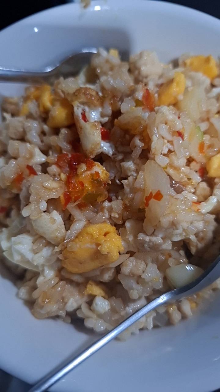 อาหารเช้า แบบจานเดียว จบ 😋 ข้าวผัดทรงเครื่องน้ำมันมะกอก - ไข่ไก่ แยกเป็น เจียวข้าวผัด + ไข่ดาว - เห็ดหอม - กุ้งสด - เนื้อไก่ - แครอท - กระเทียม
