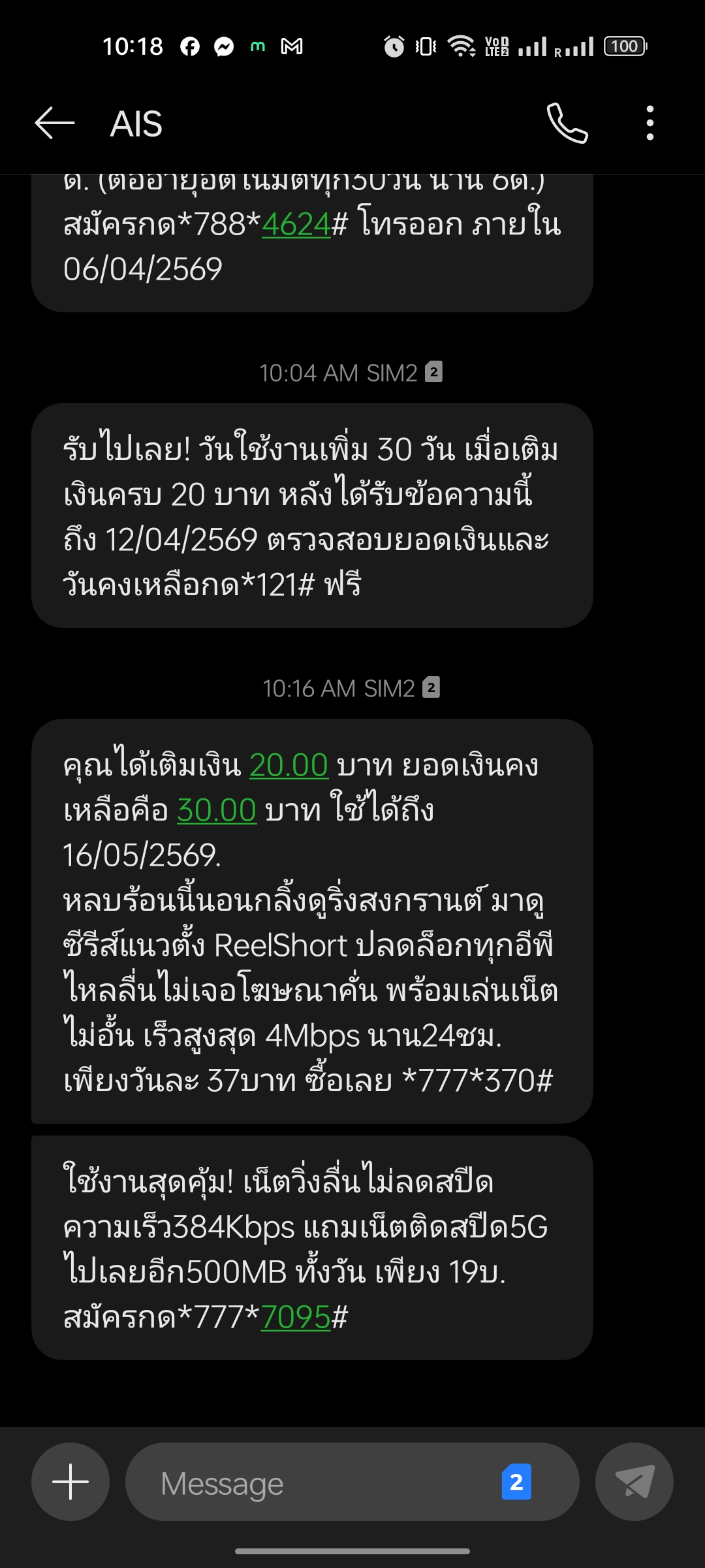 ซึ่งโดยปกติ เราเติม 10 บาท ก็จะได้วันใช้งาน 30 อยู่แล้ว แต่พอเห็น SMS นี้ วันใช้งานเราจะหมด 16/04/2569 ก็ควรจะเป็น 16/06/2569 หรือ016/07/2569 ถูกต้องหรือไม่?