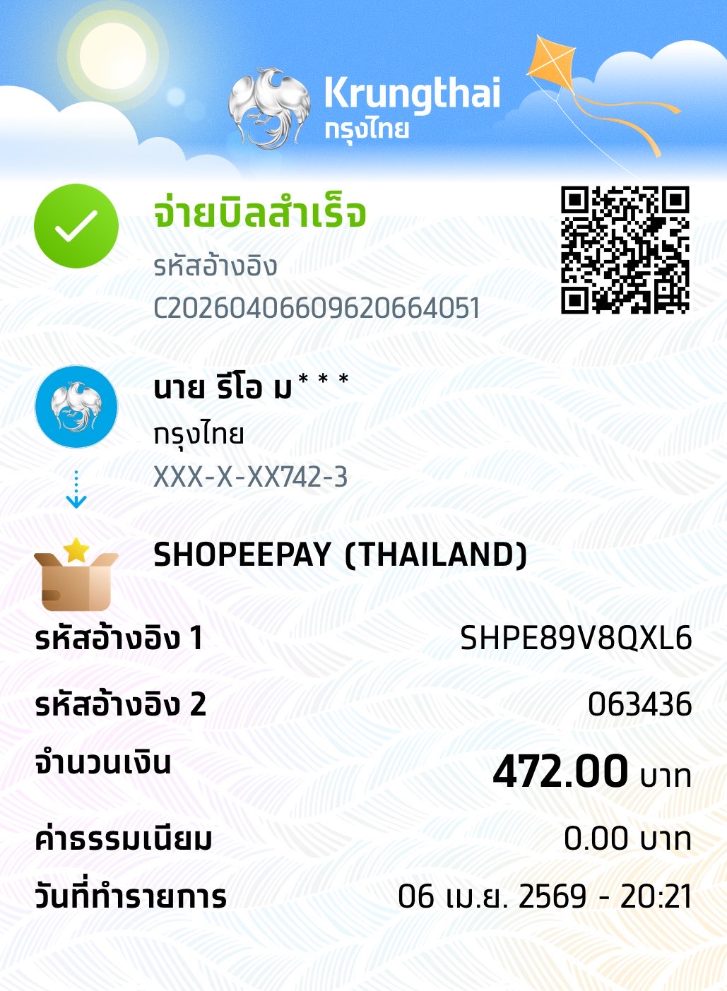 สั่งซื้อสินค้าทางshopeeไป2รายการรวม472บาทโดยเก็บเงินปลายทาง ในวันที่6เมย.69 ต้องเดินทางไปรพ.จึงตัดสินใจชำระเงินล่วงในแพตฟอร์มการสั่งซื้อทั้ง 2รายการ472บาท