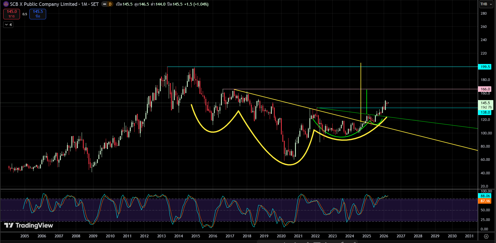 SCB ราคาก็ขึ้นมาตามจินตนาการ ตามลำดับ รอดูว่า มันจะถึงเป้า จริงไหมครับ เป้าแรกสีเขียว เป้าถัดไปสีเหลือง