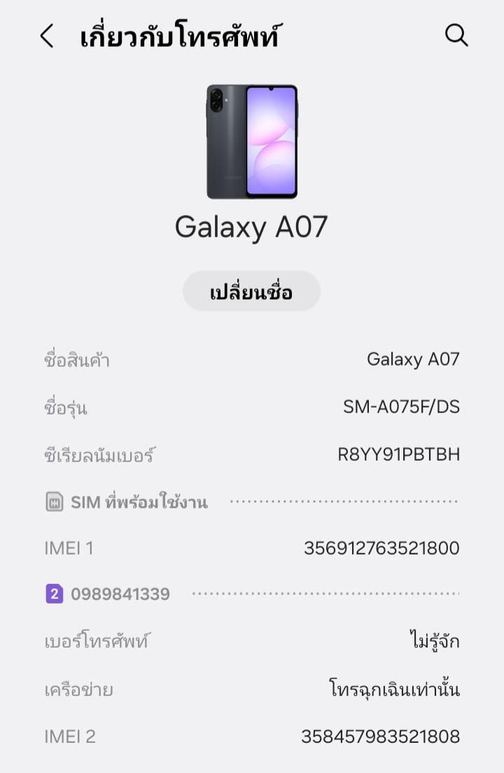 ☆☆ รบกวนตรวจอย่างละเอียดว่าหมายเลขซิมด้านหลังซิมคือหมายเลขเดียวกันกับเบอร์ไหมที่ใช้ส่งข้อความ ตรวจจนตรวจอีมี่ของซิมและเครื่องโทรศัพท์ด้วย เพราะภาพเครื่อง Samaung A07 นี้เป็นเครื่องที่ผมใช้งานอยู่