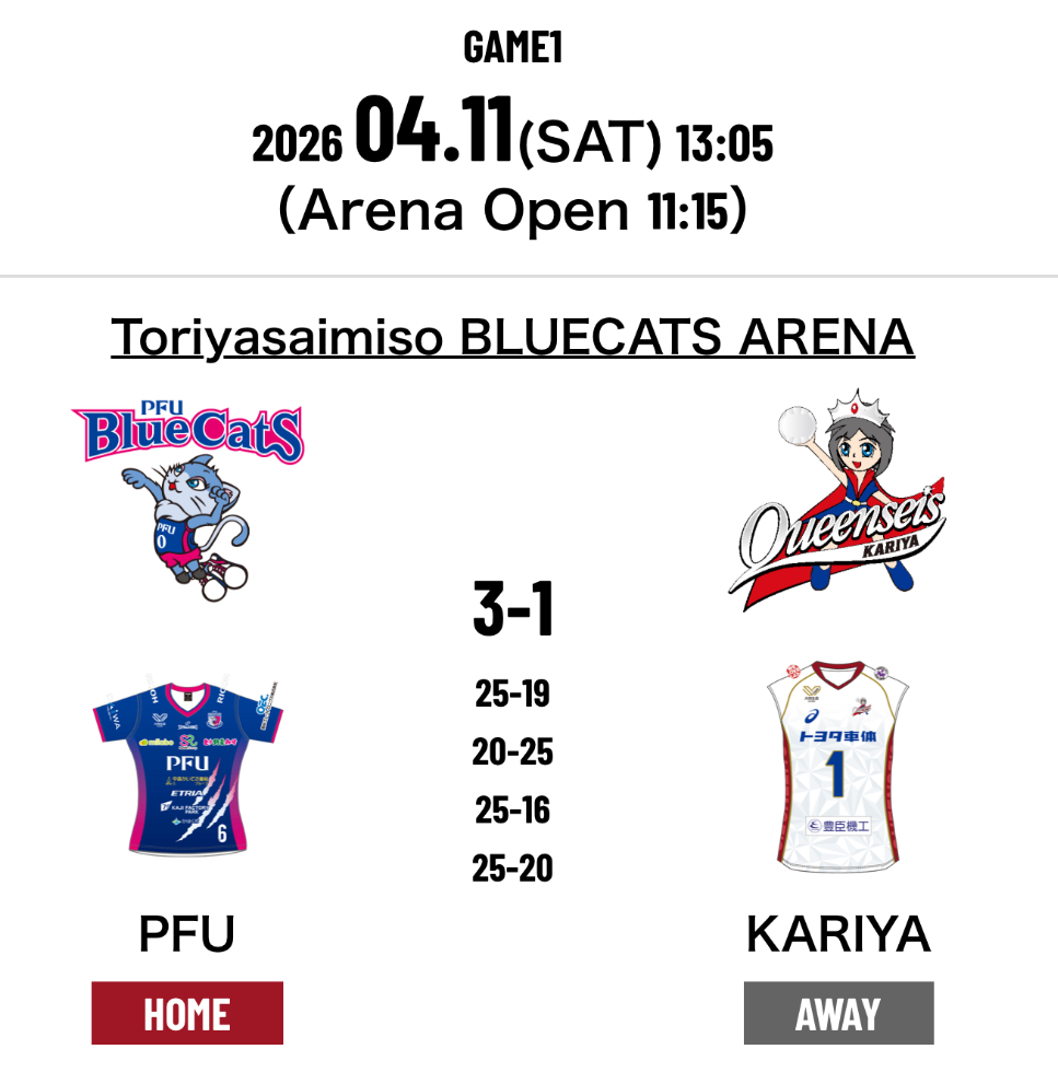1.PFU Blue Cats Ishikawa Kahoku 3-1 Queenseis Kariya (25-19 20-25 25-16 25-20)
