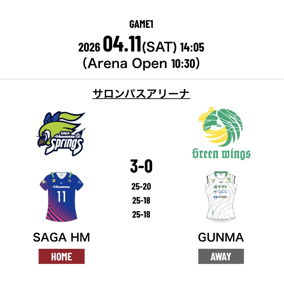 2.SAGA Hisamitsu Springs 3-0 Gunma Bank Green Wings (25-20 25-18 25-18)
