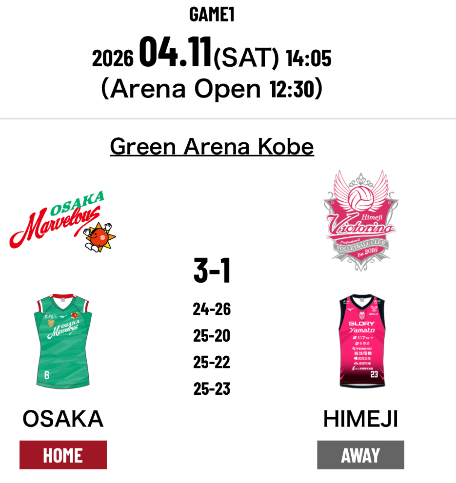 3.Osaka Marvelous 3-1 Victorina Himeji (24-26 25-20 25-22 25-23)