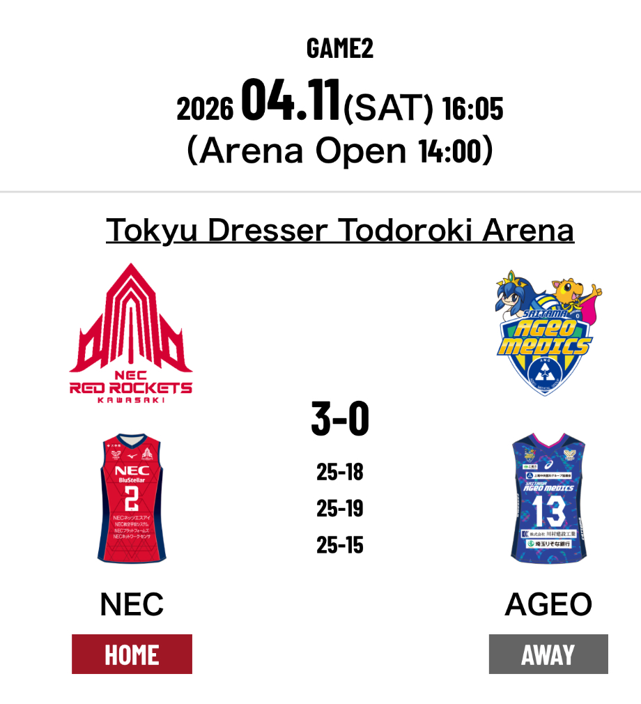 4.NEC Red Rockets Kawasaki 3-0 Saitama Ageo Medics (25-18 25-19 25-15)