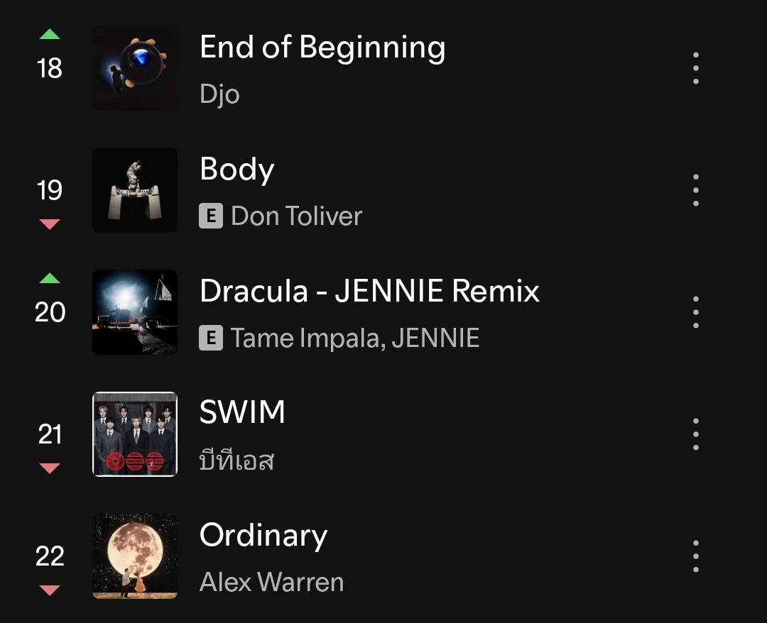 เพลง ‘Dracula’ (Remix) โดย Tame Impala และ JENNIE ขึ้นสู่จุดสูงสุดใหม่ที่อันดับ #11 (+2) บนชาร์ต Spotify ทั่วโลก ด้วยยอดสตรีม 3,605,997 ล้านครั้ง นอกจากนี้ยังขึ้นสู่จุดสูงสุดใหม่ที่อันดั