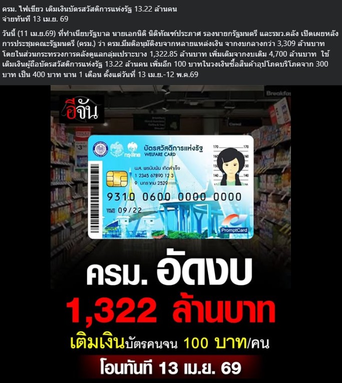 ครม. ไฟเขียว เติมเงินบัตรสวัสดิการแห่งรัฐ 13.22 ล้านคน ซื้อสินค้าอุปโภคบริโภคจาก 300 บาท เป็น 400 บาท นาน 1 เดือน