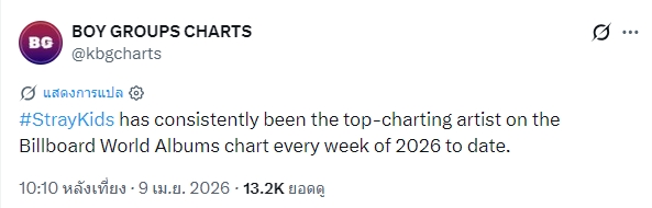 🔥 Stray Kids ติดชาร์ต Billboard World Albums อย่างต่อเนื่องมากที่สุดทุกสัปดาห์ตลอดปี 2026 จนถึงปัจจุบัน