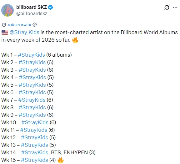 🔥 Stray Kids เป็นศิลปิน K-pop ที่มีผลงานติดชาร์ต Billboard World Albums มากที่สุดในทุกสัปดาห์ของปี 2026 จนถึงปัจจุบัน