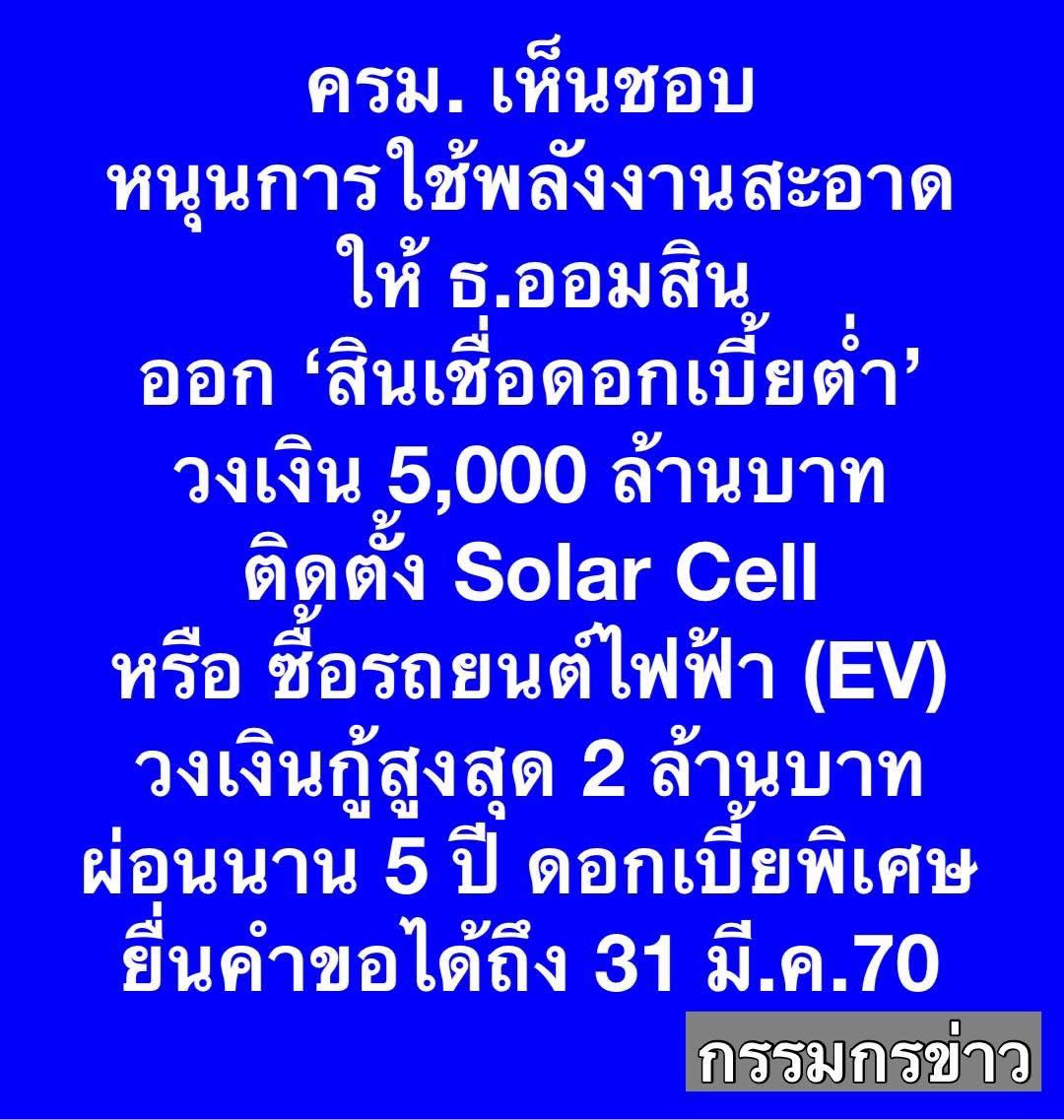 ครม. เห็นชอบ มาตรการหนุนการใช้พลังงานสะอาด ให้ธนาคารออมสิน ออกสินเชื่อดอกเบี้ยต่ำ (Soft Loan) วงเงิน 5,000 ล้านบาท สำหรับติดตั้ง Solar Cell หรือซื้อรถยนต์ไฟฟ้า (EV) , จักรยานยนต์ไฟฟ้า วงเงินกู้สูงสุด 2 ล้านบาทต่อราย ผ่อนนาน 5 ปี ดอกเบี้ยพิเศษ ยื่นคำขอได้ถึง 31 มี.ค. 2570
