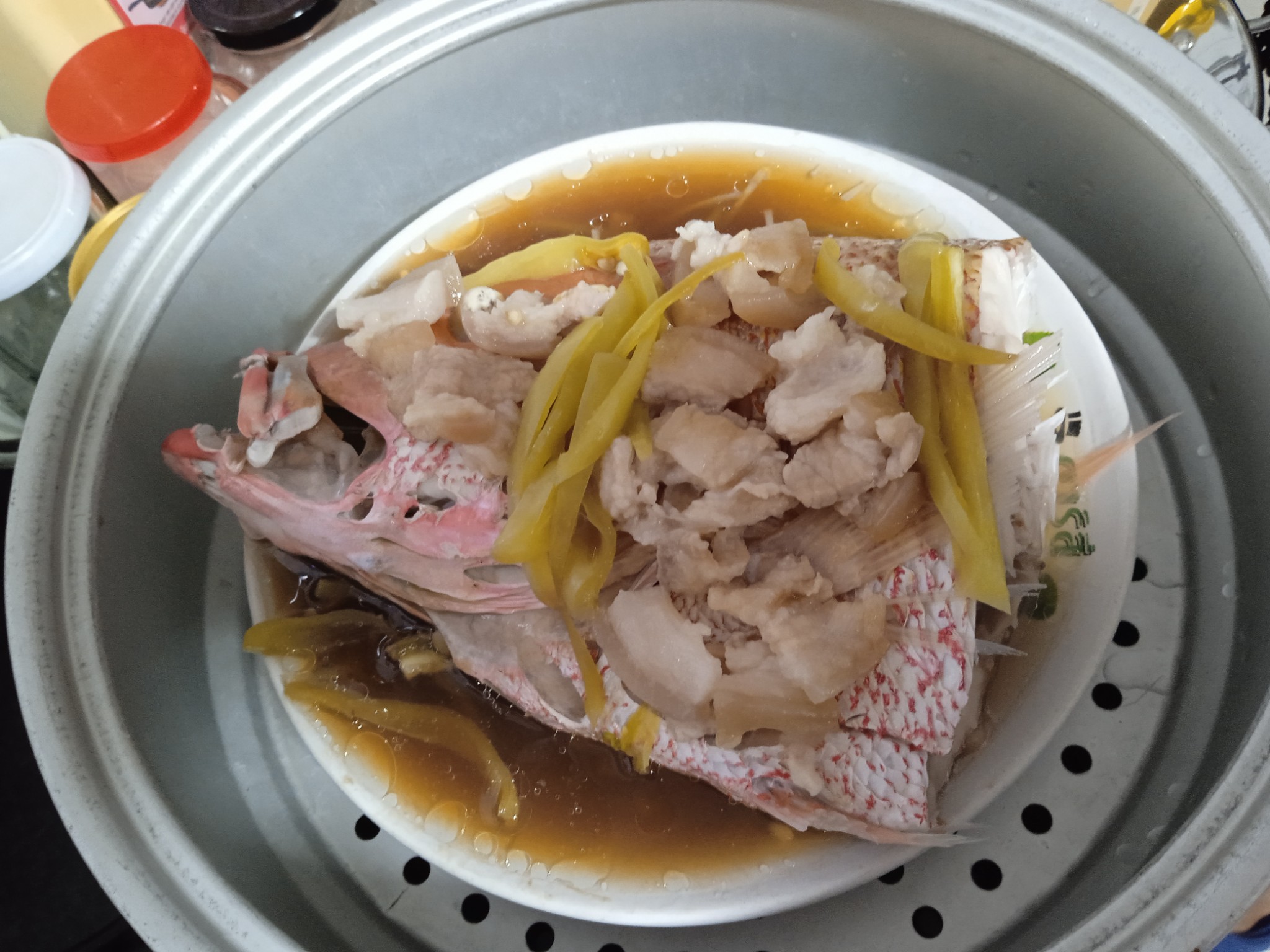 ปลากะพงแดงนึ่งซีอิ๊วใส่หมูสามชั้น เนื้อปล่กะพงฟูเด้งดึ๋ง หมูสามชั้นมัน ๆ นุ่ม ๆ คลุกกับน้ำซีอิ๊ว อร่อยเลย