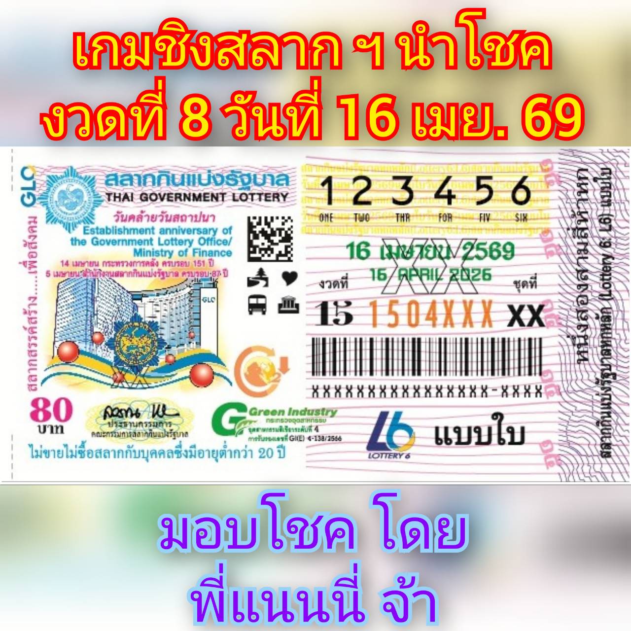 รางวัล :- สลาก ฯ นำโชค งวดที่ 8 วันที่ 16 เมษายน 2569 จำนวน 3 รางวัล ๆ ละ 3 ใบ และ กิตติมศักดิ์ 1 รางวัล คือ น้องแก้ม ครับ