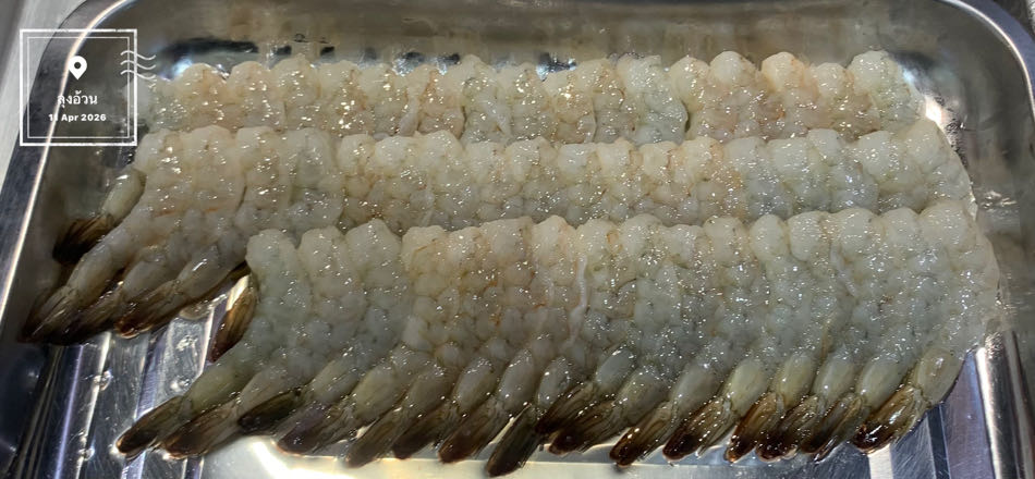 จัดเรียงสวย กุ้งเด้งกรอบ บนถาดสแตนเลสใต้น้ำแข็ง