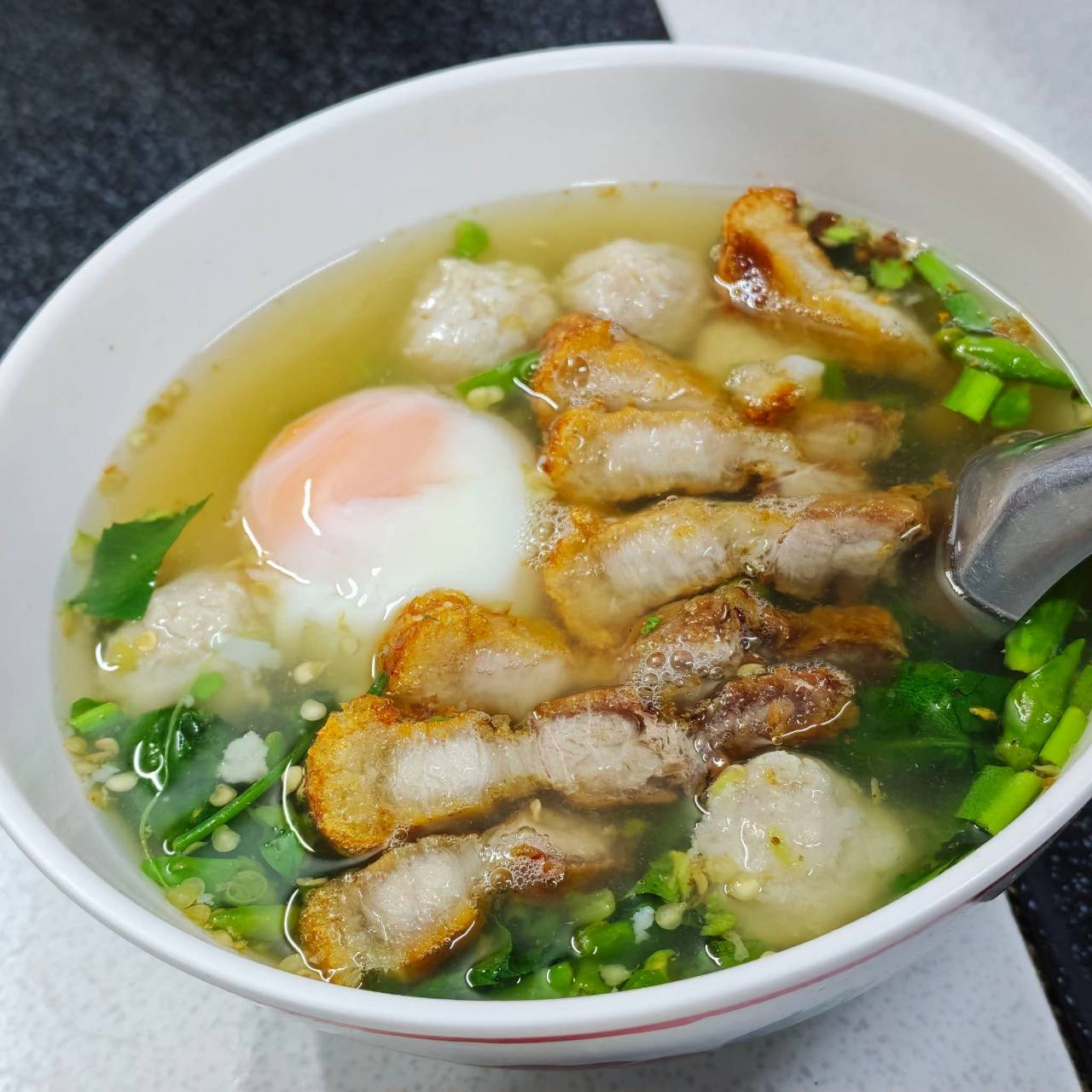 ของต้มเล้งใส่ลงมาในชามต้มเลือดหมู รสชาติน้ำซุปก็จะออกเปรี้ยวและเผ็ด ส่วนทีเด็ดของทางร้สนคือหมูกรอบ