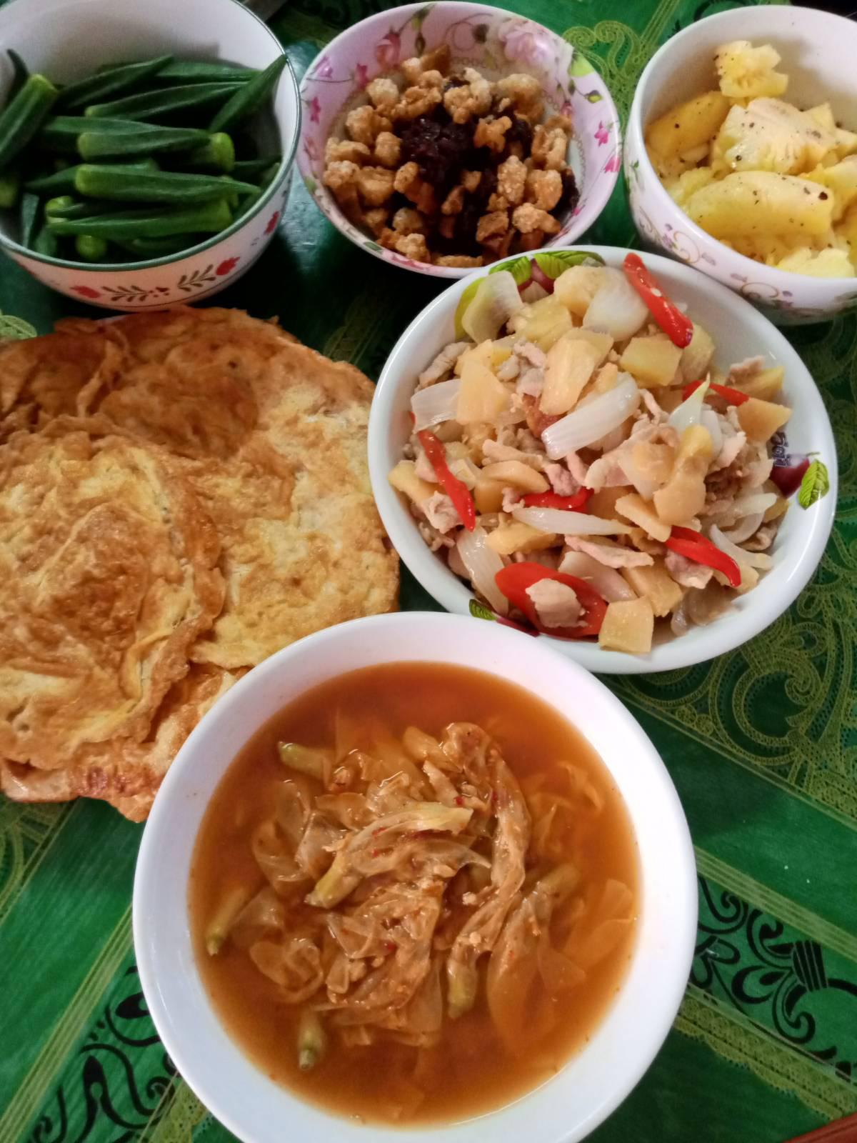 แกงส้มดอกแค ไข่เจียว ผัดเปรี้ยวหวาน และน้ำพริกกากหมู