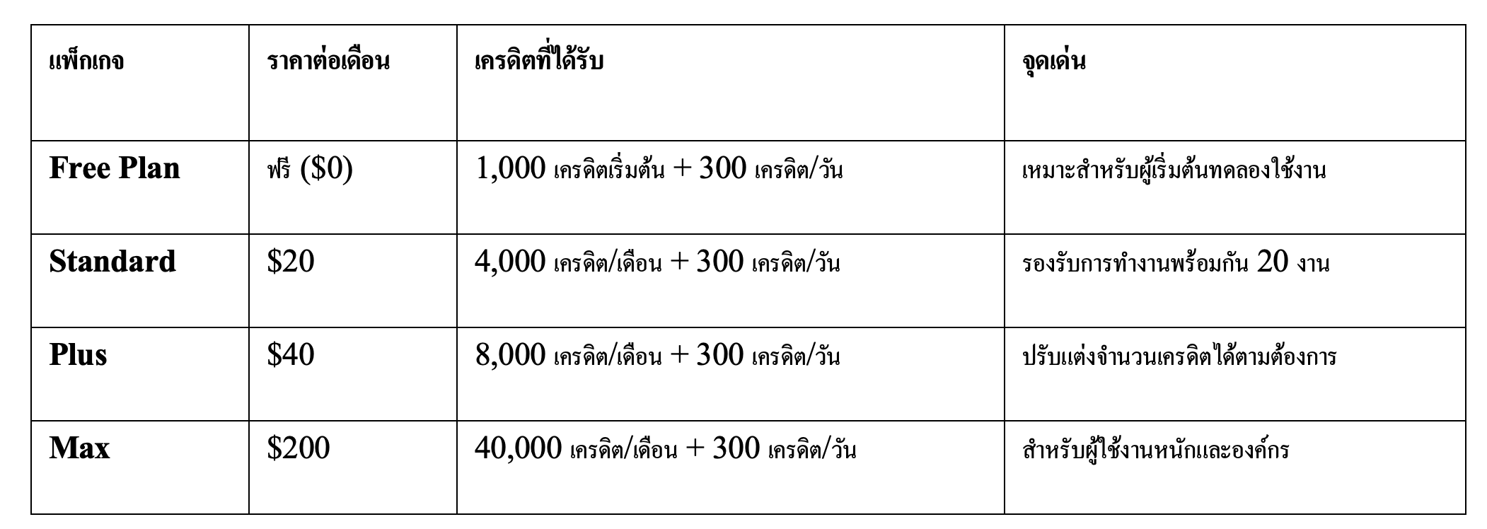 • การใช้เครดิต งานที่ซับซ้อนมากๆ อาจใช้เครดิตสูงถึง 1,000 เครดิตในครั้งเดียว ดังนั้นควรวางแผนการสั่งงานให้ดีหากคุณใช้แพ็กเกจฟรี