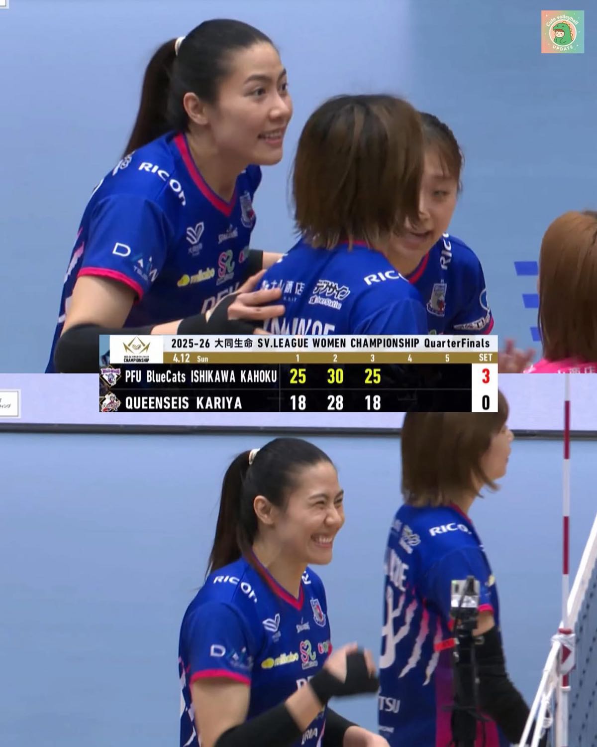 PFU Bluecats Ishikawa Kahoku 3 - 0 Queenseis Kariya (PFU ชนะ Kariya 2-0) Top Score PFU 23.Melissa Valdez 21 Pts 2 Blk 15.Thatdao Nuekjang 12 Pts 2 Blk 1.Yokota Mami 11 Pts 4 Blk 8.Okuma Kisa 9 Pt