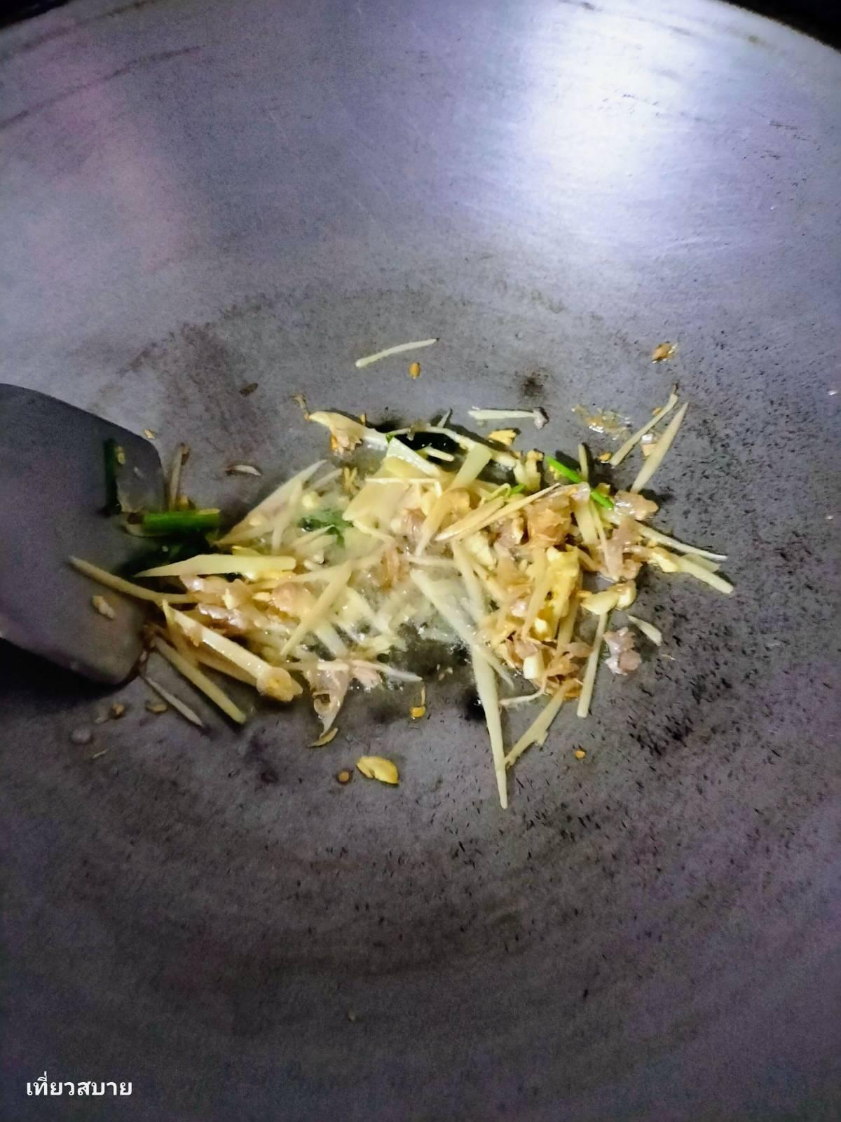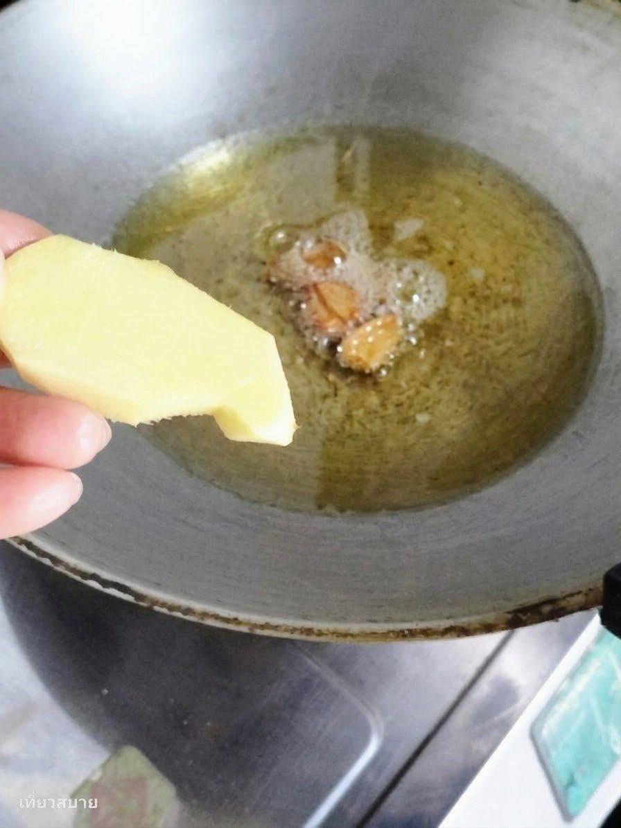 ตามด้วยขิงซอย ผัดให้ขิงสลดและส่งกลิ่นหอม น้ำมันหอมระเหยจากขิงจะช่วยชูรสชาติอาหารได้ดีมากค่ะ