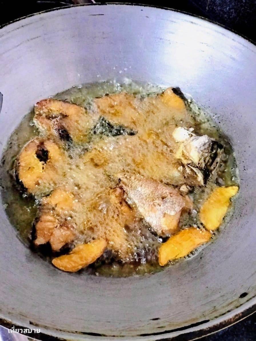 ทอดปลาจนเหลืองทั้งสองด้าน ตักขึ้นพักให้สะเด็ดน้ำมัน