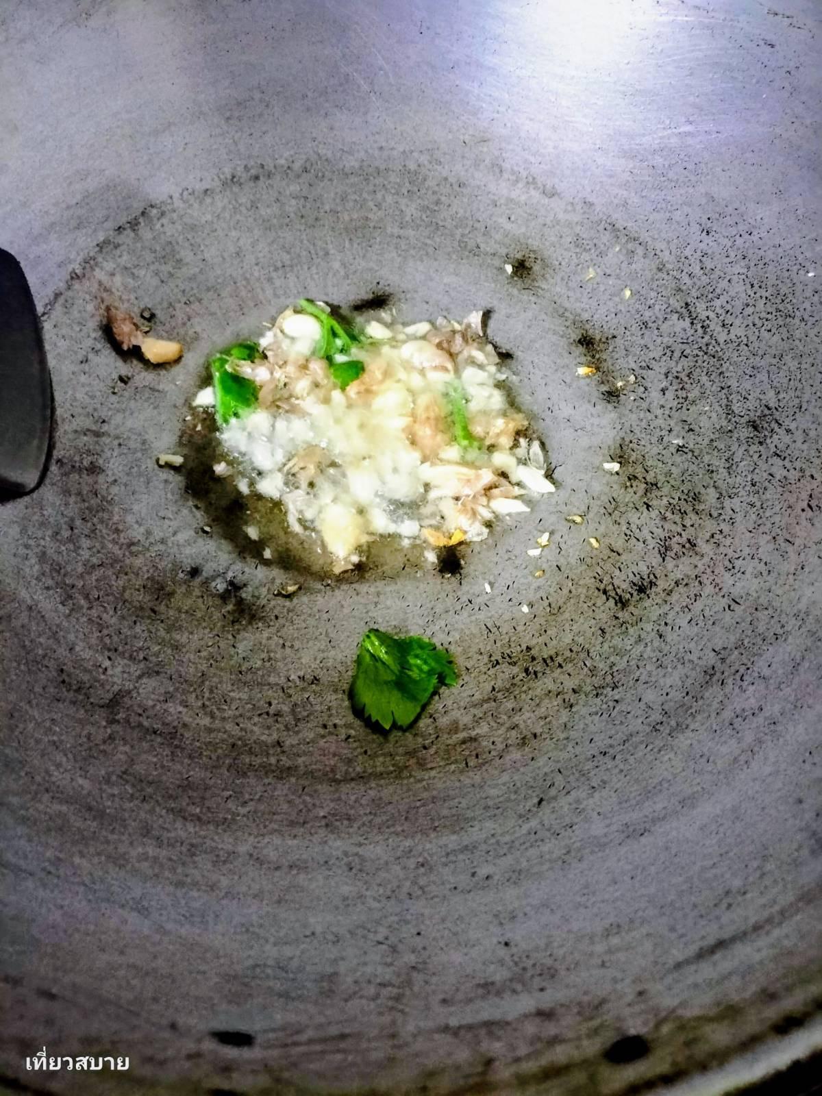 ตั้งกระทะใหม่ ใส่น้ำมันเล็กน้อย เปิดไฟแรง ใส่กระเทียมลงไปผัดจนหอม