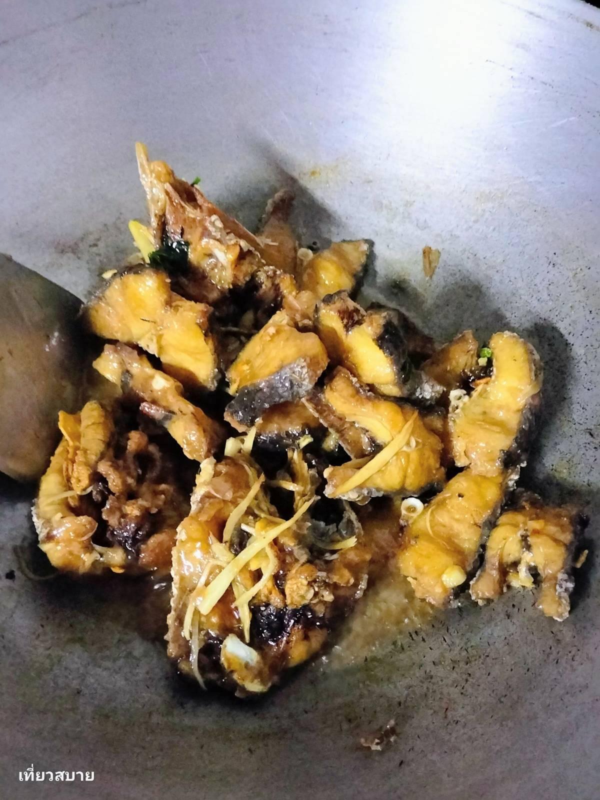 ผัดให้ส่วนผสมเข้ากัน ชิมรสชาติให้ออกเค็มนำและมีหวานตามบางๆ จากนั้นนำปลาที่ทอดพักไว้ ลงไปคลุกเร็วๆ