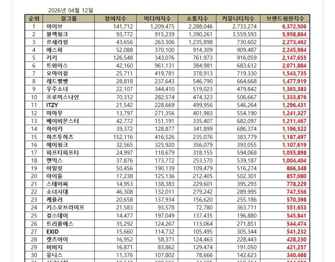 30 อันดับ วงเกิร์ลกรุ๊ปยอดนิยมประจำเดือน เมษายน [Brand Ranking]