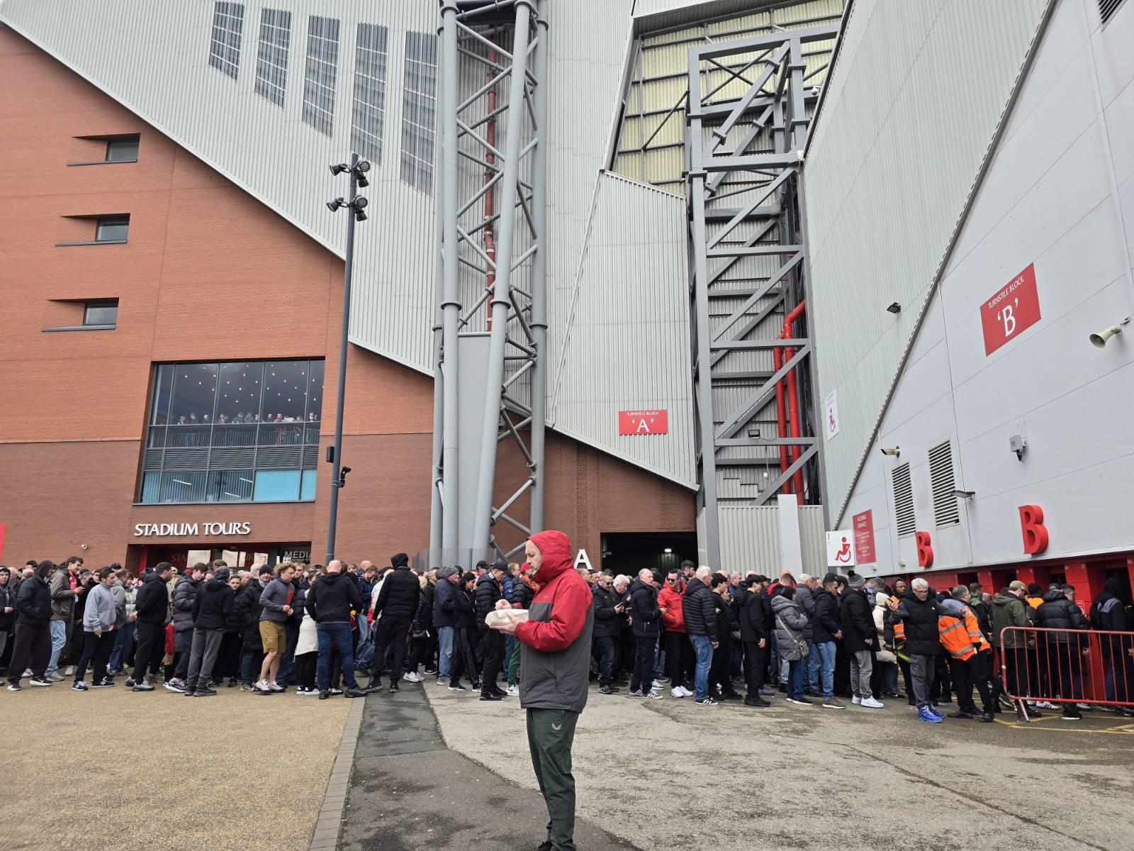 หน้าสนาม (เพิ่มเติม) แฟนบอลต่อคิวเพื่อผ่านเข้าประตู
