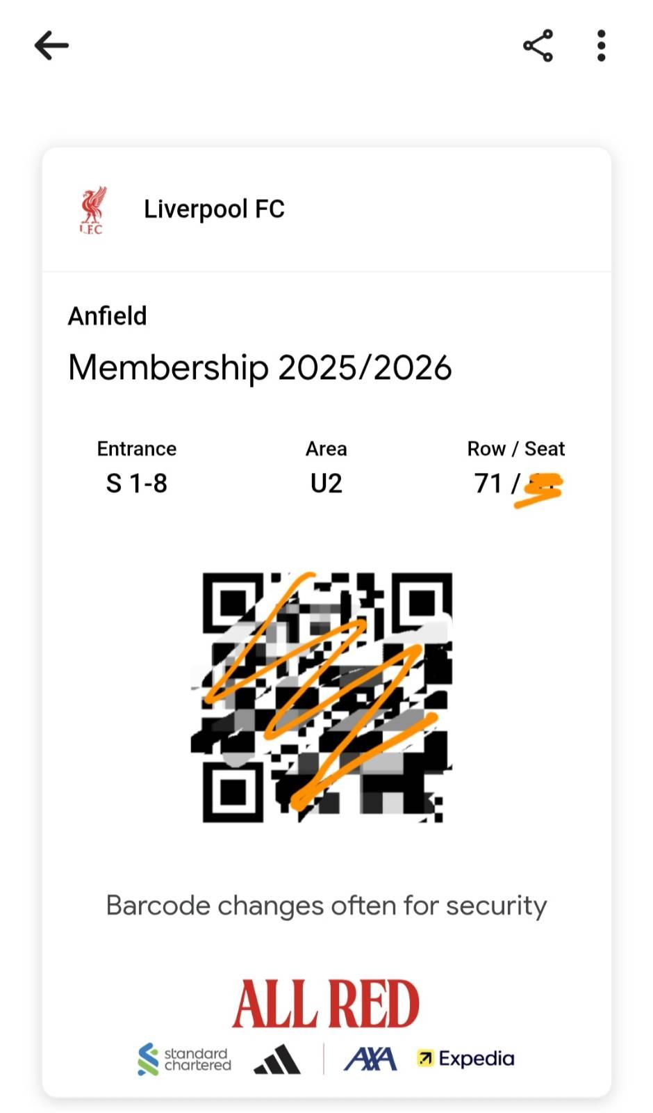 - link ตั๋วที่นั่งนี้จะส่งให้เราไม่กี่วันก่อนบอลเตะ ทุกครั้งที่คลิกลิงค์บาร์โค้ดจะเปลี่ยนไปเรื่อยๆเพื่อความปลอดภัย ไปถึงหน้าสนามค่อยคลิกลิงค์เพื่อเอาบาร์โค้ดตัวที่อัพเดท (จึงไม่สามารถที่จะแคปหน้าจอบาร์โค้ดตัวนี้ล่วงหน้าหลายๆวัน เพื่อเอาไปสแกนที่สนามได้)