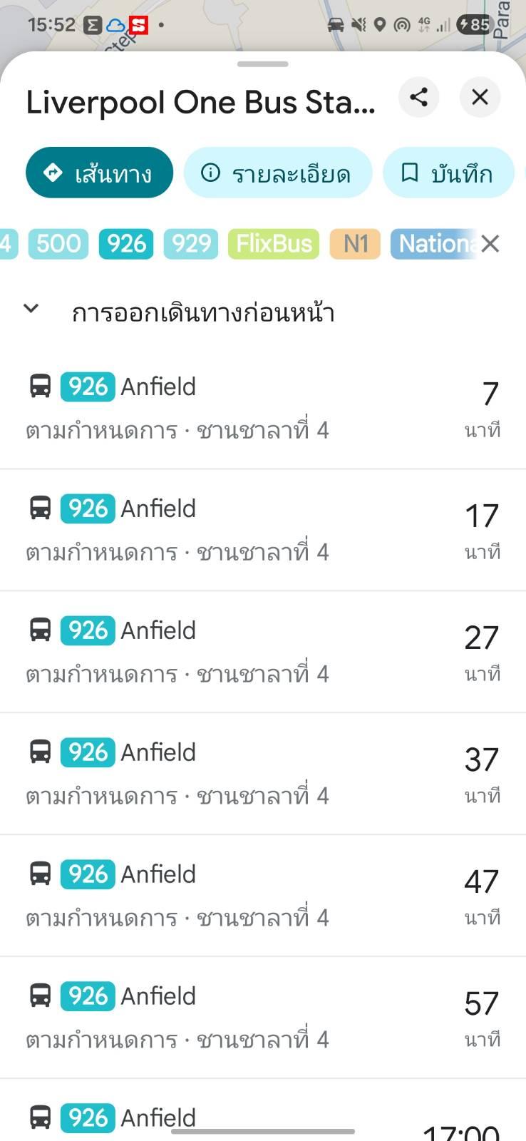 - รถเมล์ 927 จากสนามมา Liverpool One bus station ประมาณเกือบ 1 ชั่วโมง เพราะช่วงรถออกจากสนามรถจะติดมากสุดโต่ง ติดไฟแดงและขยับตัวได้เล็กน้อย พ้นจุดนี้ก็จะไหลลื่น ขาไปสนามใช้เวลาไม่ถึงครึ่งชั่วโมง