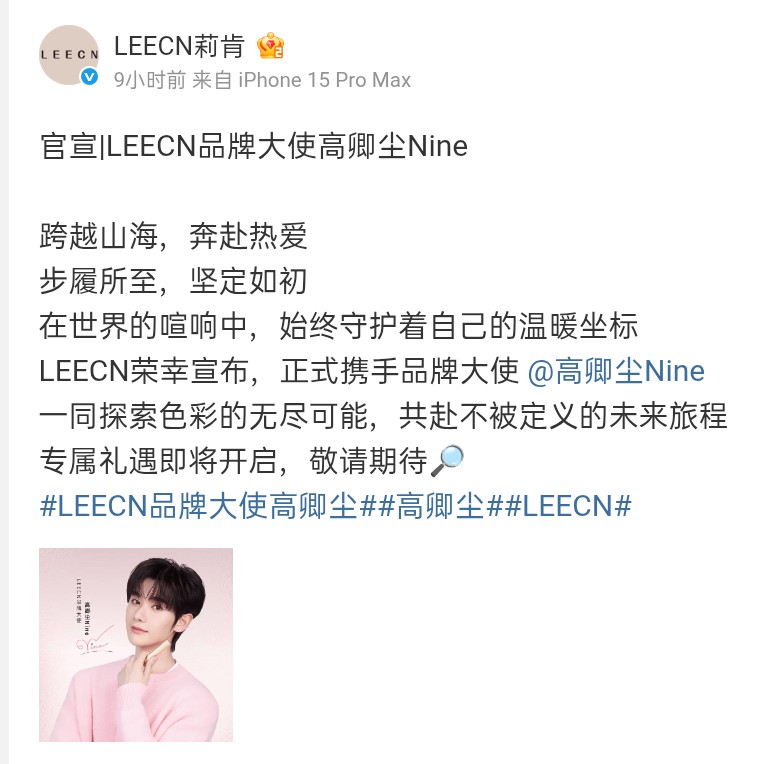 “ประกาศอย่างเป็นทางการ | LEECN เปิดตัว 高卿尘 Nine ในฐานะ Brand Ambassador
