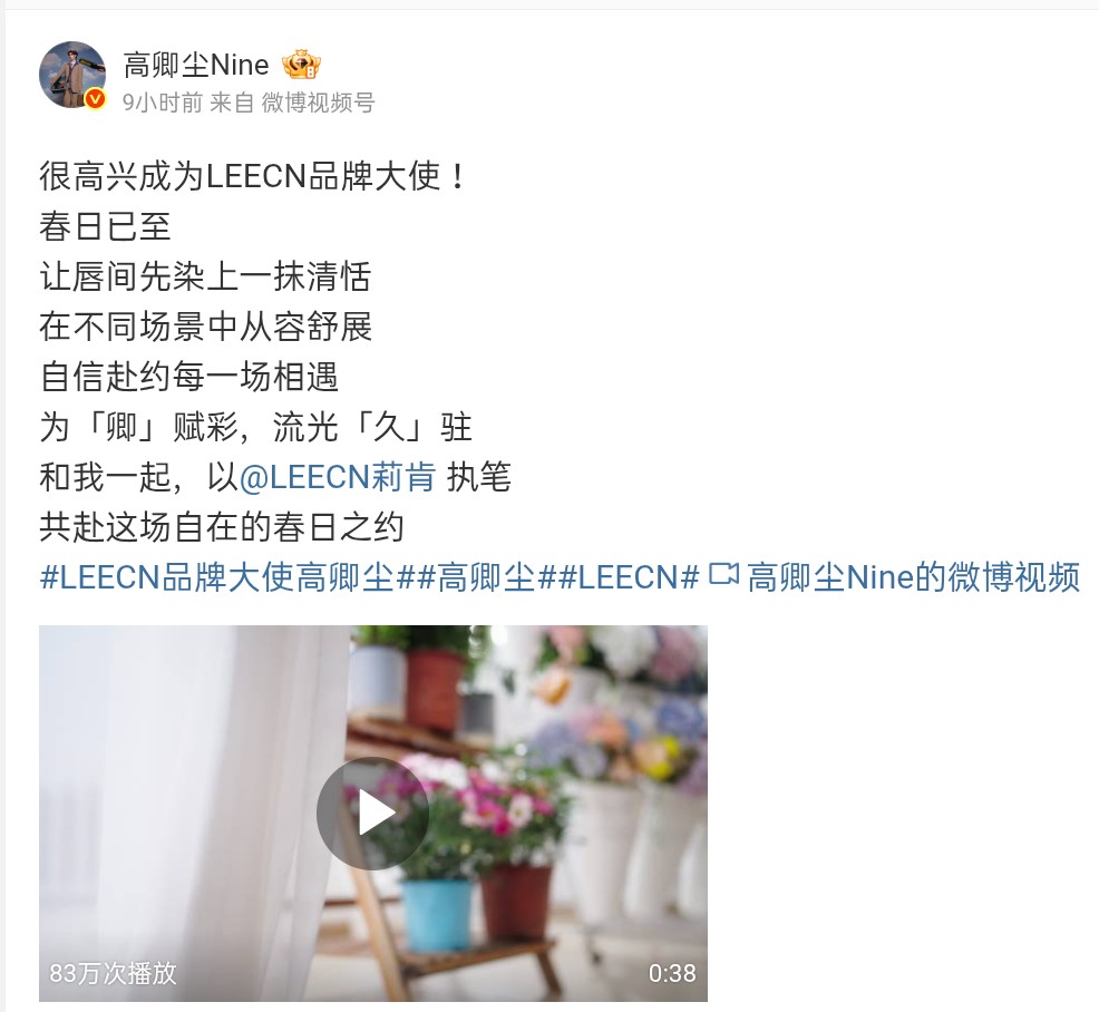 เกาชิงเฉิน เสียวจิ่ว (高卿尘 Nine) ศิลปินนักร้องนักแสดงจากประเทศไทย ได้รับการเปิดตัวเป็น Brand Ambassadors ของแบรนด์ LEECN โดยก่อนหน้านี้มีการโพสใบ้มากมายเกี่ยวกับศิลปินปริศนาที่จะมาร่วมงานกับทางแบรนด์ วันนี้เฉลยแล้ว น้องนายจริงๆด้วย ❤️💄🤭