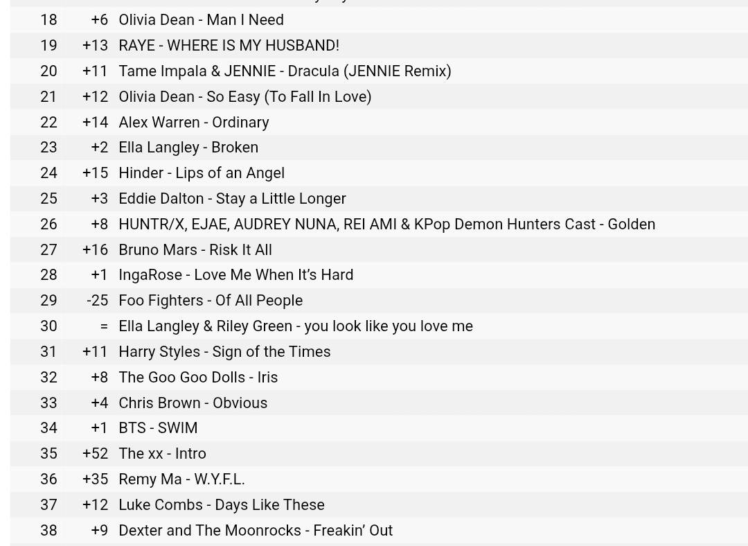 เพลง Golden จาก KPOP Demon Hunters ตามมาที่อันดับ 26 และ เพลง SWIM ของ BTS ตามมาในอันดับ 34 นับว่าเจนนี่เข้ามาช่วยกระตุ้น