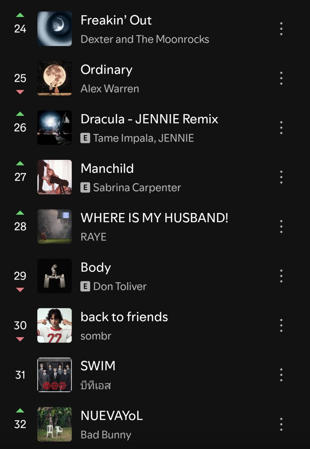 เพลง ‘Dracula’ (Remix) โดย Tame Impala และ JENNIE ขึ้นสู่จุดสูงสุดใหม่ที่อันดัย #8 (+3) บนชาร์ต Spotify ทั่วโลก ด้วยยอดสตรีม 3.74 ล้านครั้ง 🥳 นอกจากนี้ยังขึ้นสู่จุดสูงสุดใหม่ที่อันดับ #2