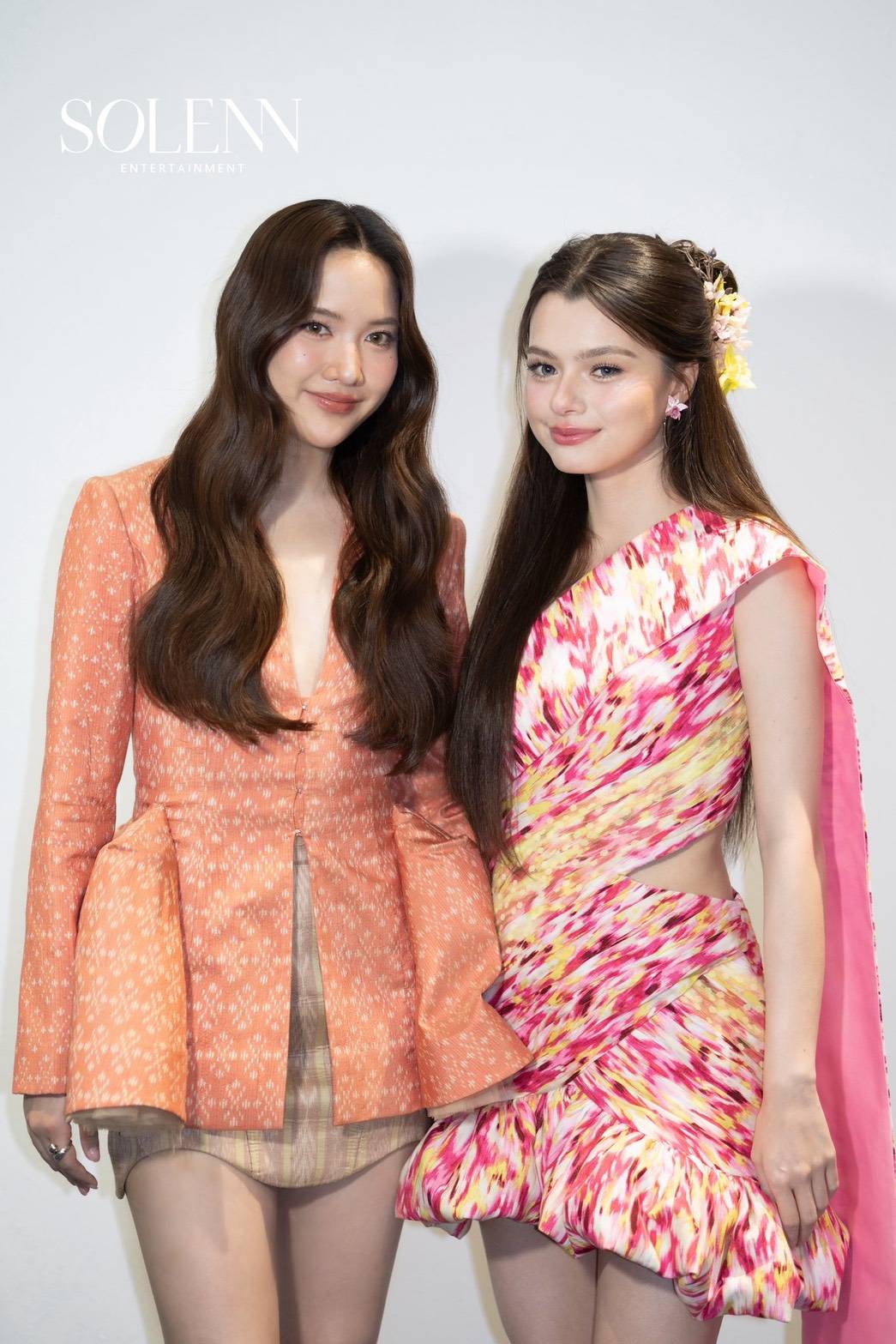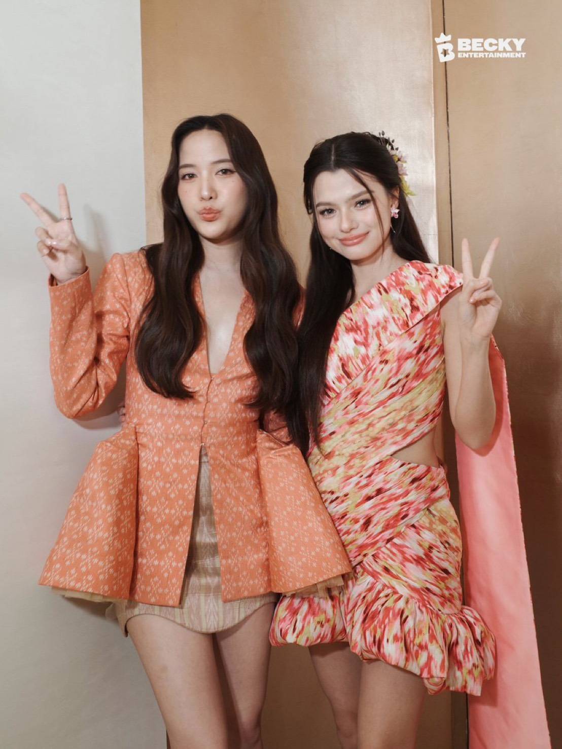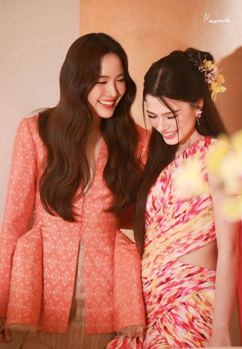 Freen Sarocha wore a latest collection piece from a famous brand, using silk with a blazer-like top and a skirt. And Becky wore a cotton outfit with a "Mudmee" pattern and draped "Sabai" (Sabai is a traditional Thai style garments).
