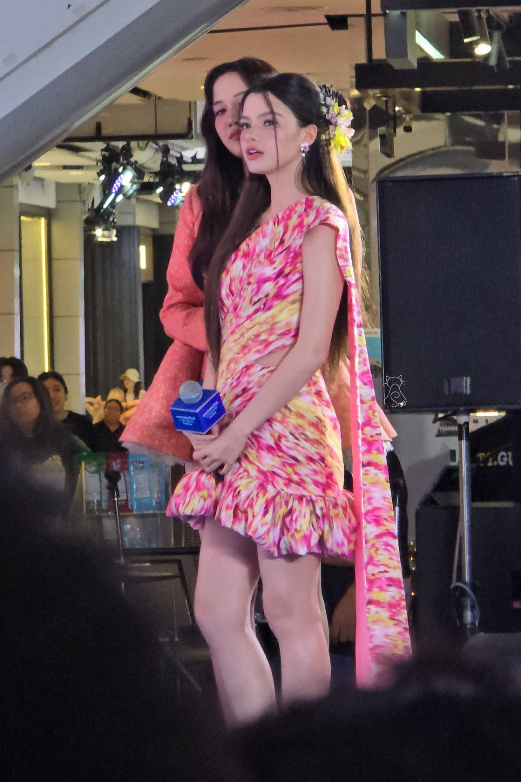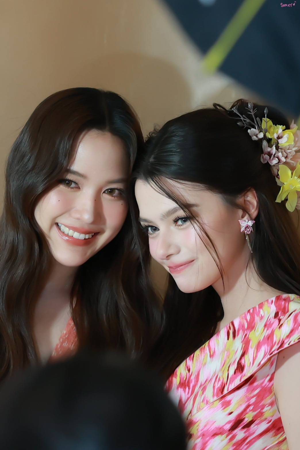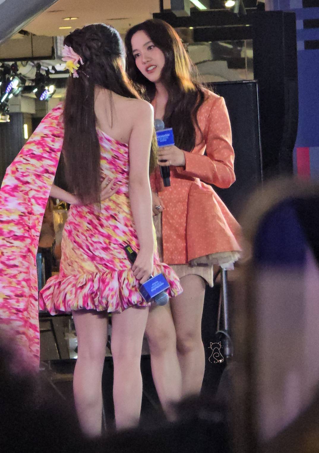 Freen Sarocha wore a latest collection piece from a famous brand, using silk with a blazer-like top and a skirt. And Becky wore a cotton outfit with a "Mudmee" pattern and draped "Sabai" (Sabai is a traditional Thai style garments).