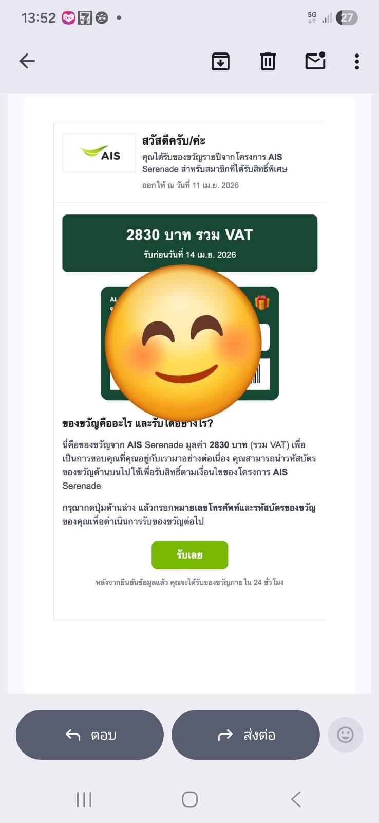 ไม่รู้ใช้ ais จริงไหม อยู่มาให้ ของขวัญ อะไร 2830 แถมให้ใส่เลข บัตรด้วย