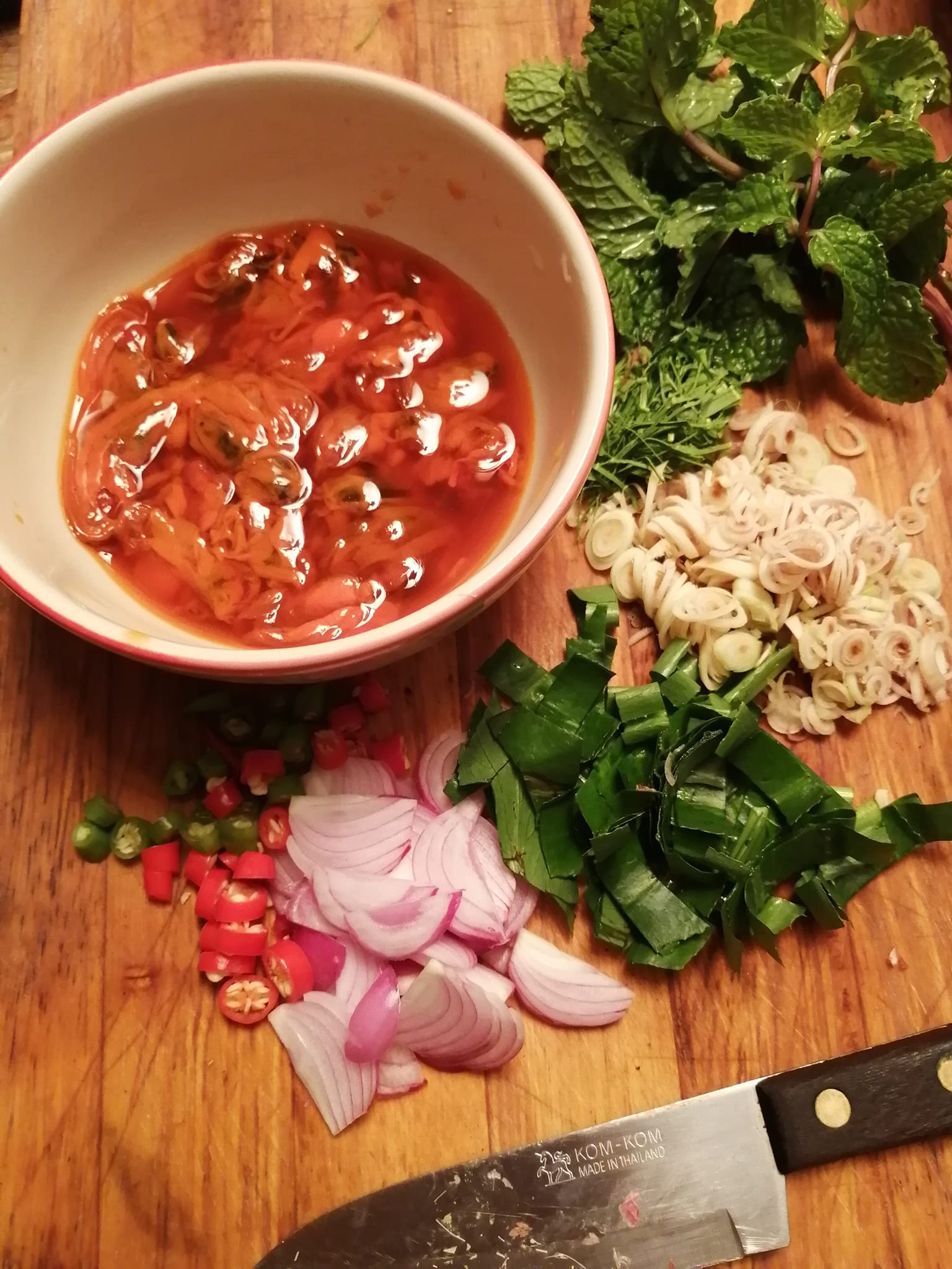 เที่ยงนี้อยากกินอะไรแซ่บๆ ค้นตู้เย็นเจอหอยดองที่ซื้อไว้นานแล้ว ค้นผักเพิ่ม เจอผักพอจะทำยำได้ซักจาน+สะระแหน่ที่ปลูกไว้กำลังจะแห้งตายพอเลย งั้นจัดไป