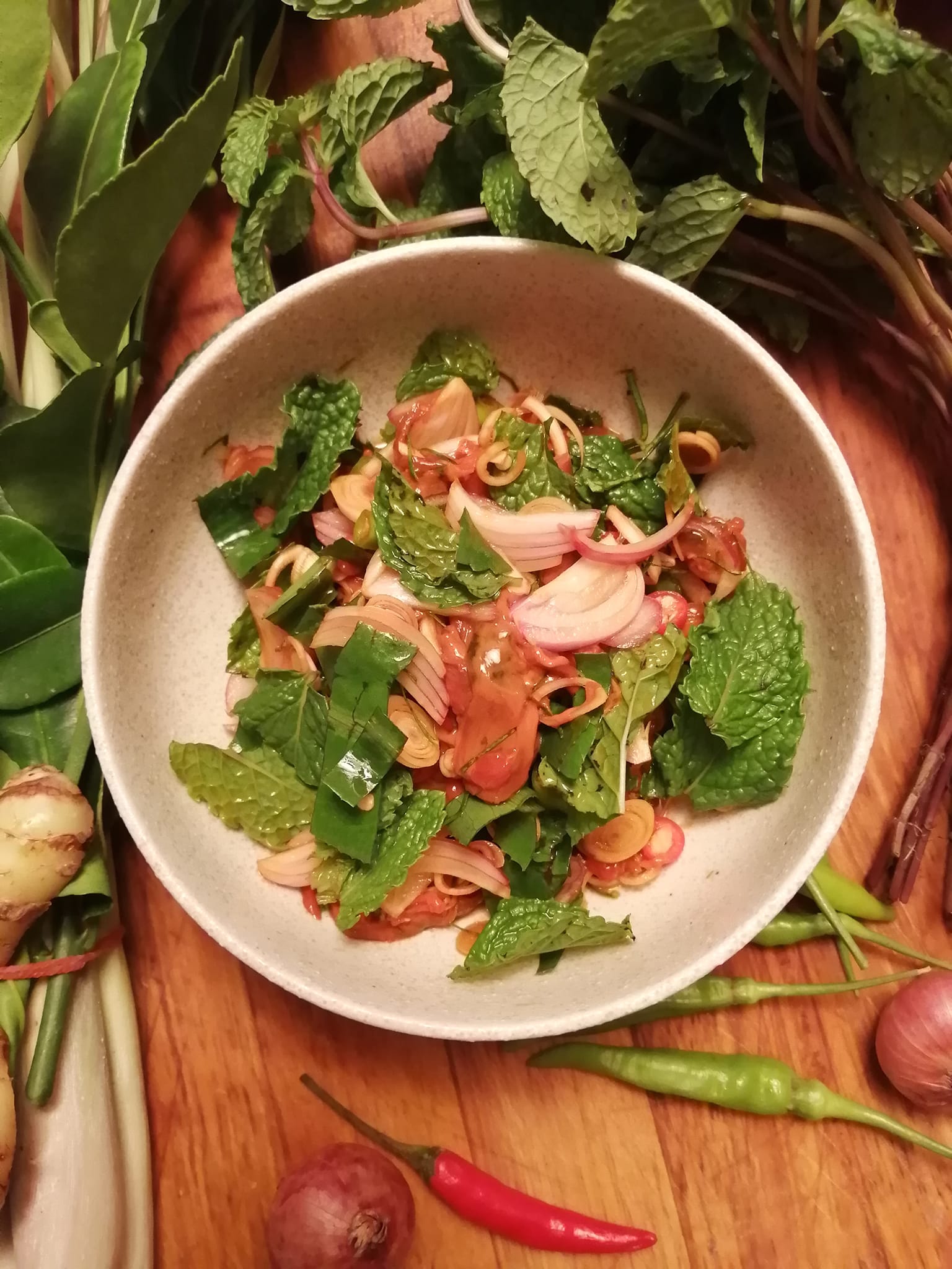 -ซอยตะไคร้, ใบมะกรูด, หอมแดง, พริก, ผักชีใบเลื่อย ถ้ามีขิงก็ใส่ไปด้วยด้วย ..แต่ผมไม่มี