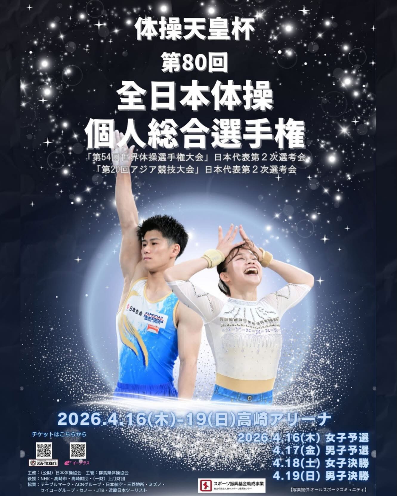 ขอเชิญชมรายการ 80th All Japan Artistic Gymnastics Championships 2026 หรือการแข่งขันยิมนาสติกสากลชิงแชมป์แห่งประเทศญี่ปุ่นปี 2026 ครั้งที่ 80 ซึ่งการแข่งขันหนนี้จะจัดขึ้นพิเศษหน่อยเพราะเป็นการจัดฉลองครบรอบ 80 ปีของการแข่งขันยิมนาสติกสากลแห่งชาติของประเทศญี่ปุ่นครับ โดยจะเริ่มแข่งขันตั้งแต่วันที่ 16 - 19 เมษายน 2569 ณ เมืองกุนมะ ประเทศญี่ปุ่นครับ