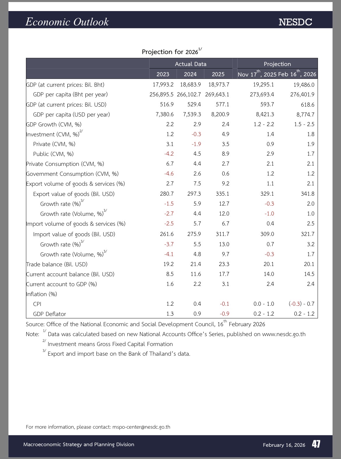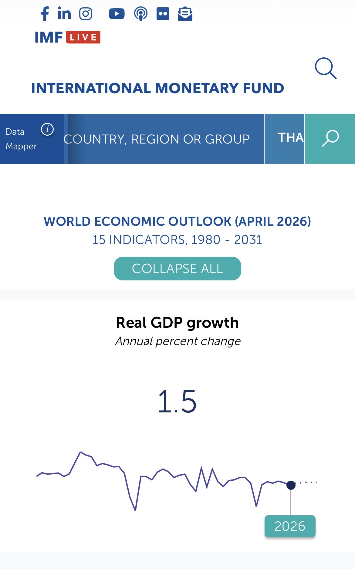 ตามที่สภาพัฒน์คาดการณ์ไว้เมื่อเดือนกุมภาพันธ์ที่ผ่านมา GDP ไทยจะอยู่ที่ประมาณ 618,000 รายได้ต่อหัวของไทยปี 2026 จะอยู่ที่ประมาณ 8,700 ดอลลาร์ต่อหัว แต่ล่าสุด IMF คาดการณ์ประจำเดือนเมษายนปี 2026 ว่า GDP ไทยอยู่ที่ประมาณ 580,000 รายได้ต่อหัวอยู่ที่ประมาณ 8,110 ดอลลาร์ต่อหัว เพิ่มมาจากปีที่แล้วแค่ประมาณ 40 เหรียญต่อหัวเท่านั้น IMF เค้าเป็นอะไรกับไทยมากไหมครับ คาดการณ์ต่ำตลอด แม้ว่า IMF บอกว่า GDP ปีนี้จะโตแค่ 1.5% เงินเฟ้อคาดว่าอยู่ที่ประมาณ 0.9% แถมอัตราแลกเปลี่ยนก็ไม่ได้อ่อนค่าจนทำให้รายได้ต่อหัวเพิ่มน้อยขนาดนี้ ผมนี่เคือง IMF หลายรอบแล้วนะ คาดการณ์ไทยต่ำตลอดและผิดตลอดด้วย อีกอย่างอยู่ดีๆก็เพิ่มประชากรให้ไทยอีกจาก 70 ล้านเป็น 71 ล้าน จะบ้ากับ IMF จริงๆ 5555+ แต่ข่าวดีคือ GDP รวมเวียดนามปีที่แล้วยังไม่แซงไทยอยู่ที่ประมาณ 494,000 ซึ่งก็ถือว่าเลขออกมาต่ำกว่าที่รัฐบาลเวียดนามประกาศที่เกิน 500,000 ไปแล้ว